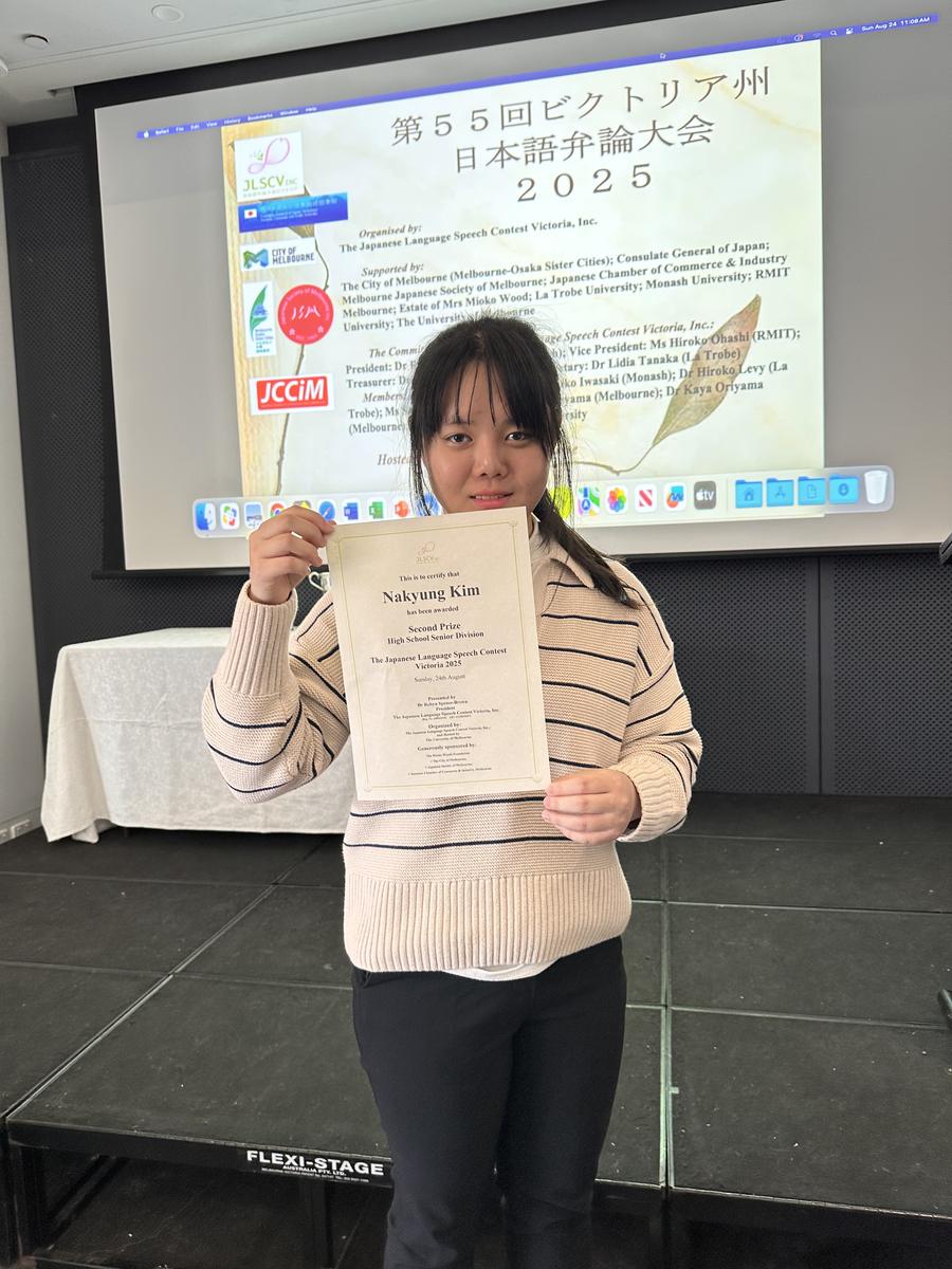 On the 27th August, Nakyung Kim of Year 10 competed in the Japanese Speech Contest Victoria in the High School Senior Division. Hosted by Melbourne University early on a Sunday morning, the contest was established to encourage learners of Japanese to practise and consolidate their language and public speaking skills.