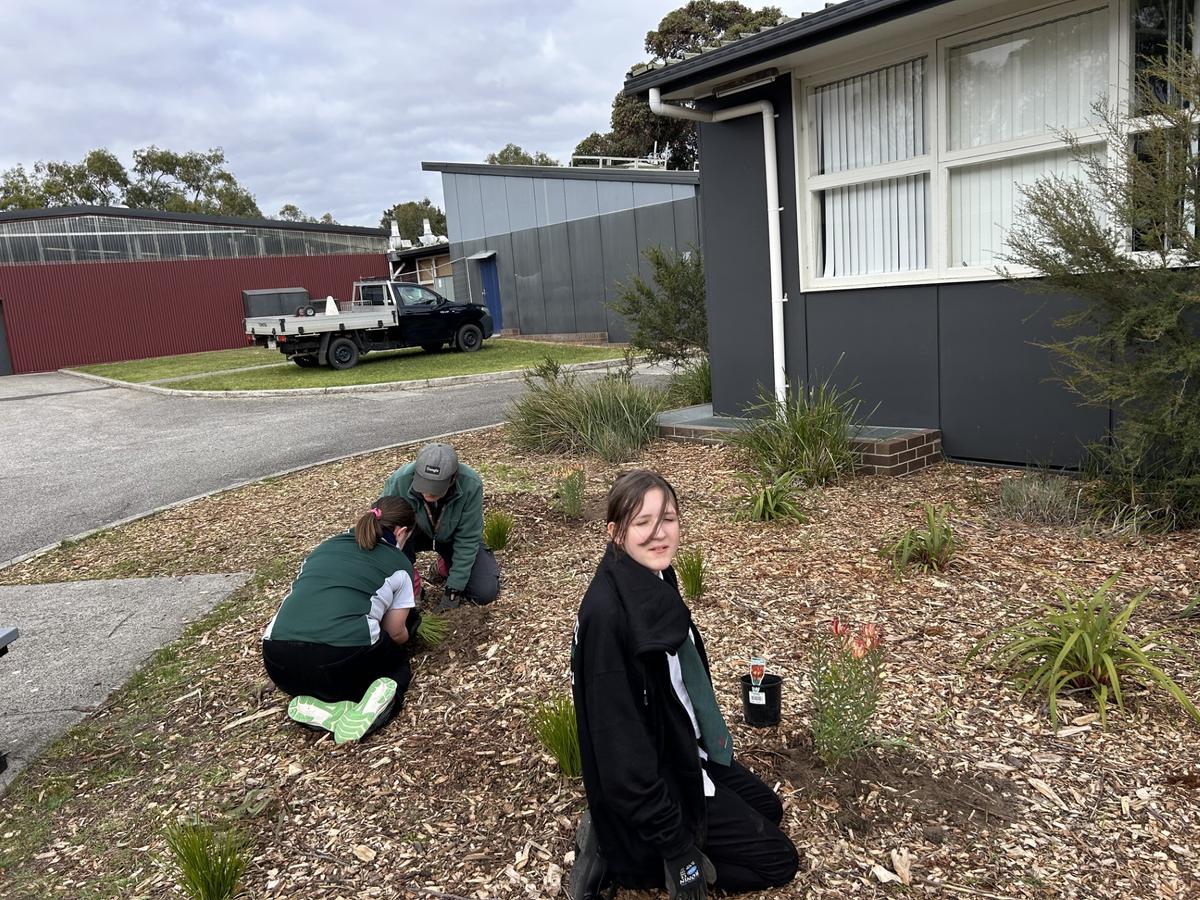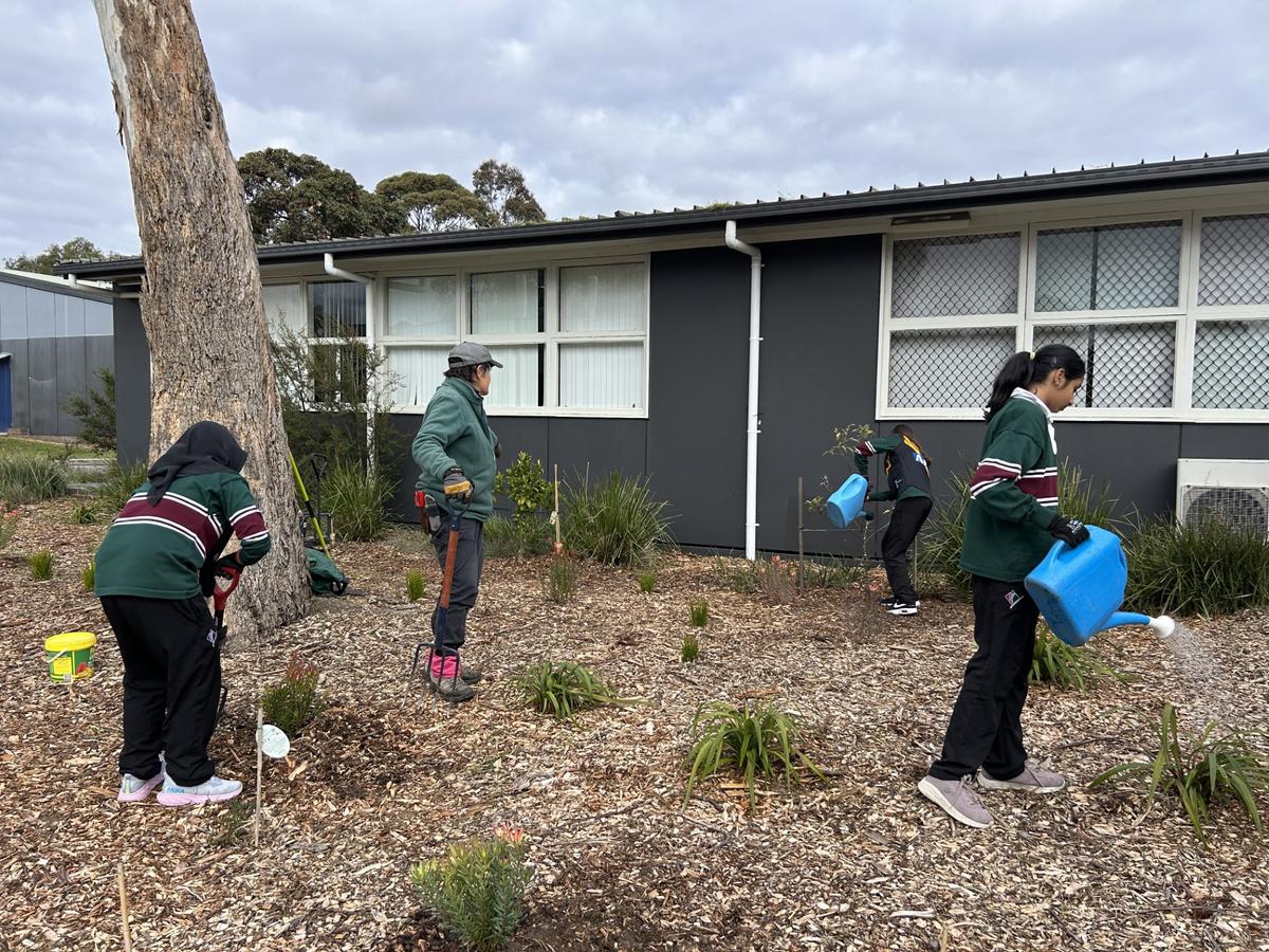 Students were engaged with every aspect of the panting: digging the space, separating the roots of pot-bound plants, fertilizing the hole, planting the shrub, then watering the plant. As the soil was rock-hard the students used a machine to loosen it before planting.