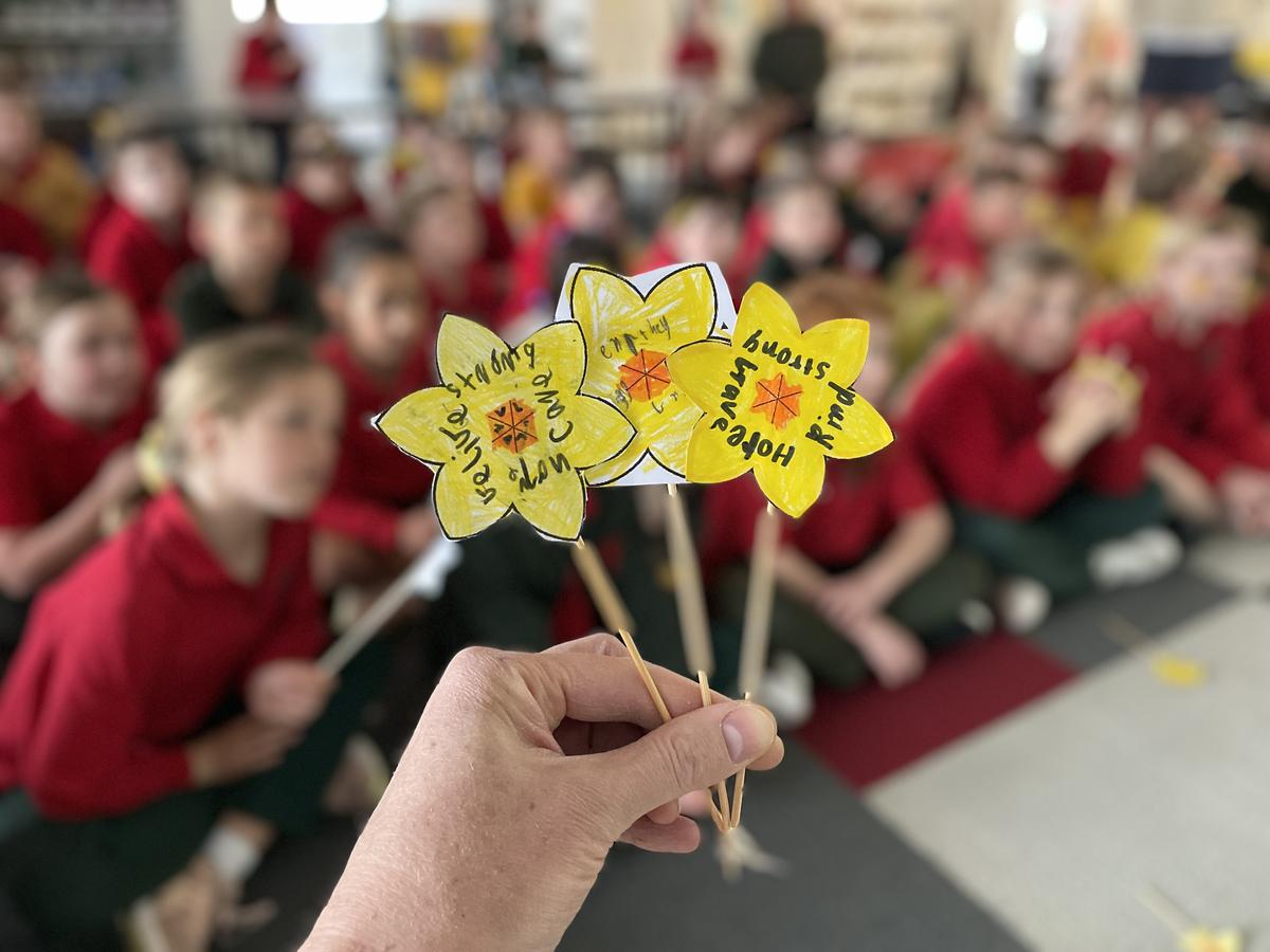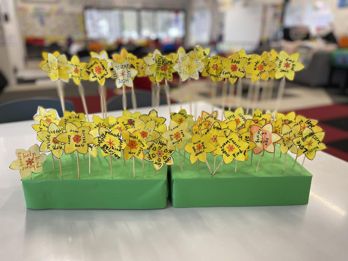 The students reflected and came up with some wonderful words of hope such as; love, care, strong, fierce, proud, brave, help, believe and courage. We then made some beautiful daffodils and wrote messages of hope on the petals.