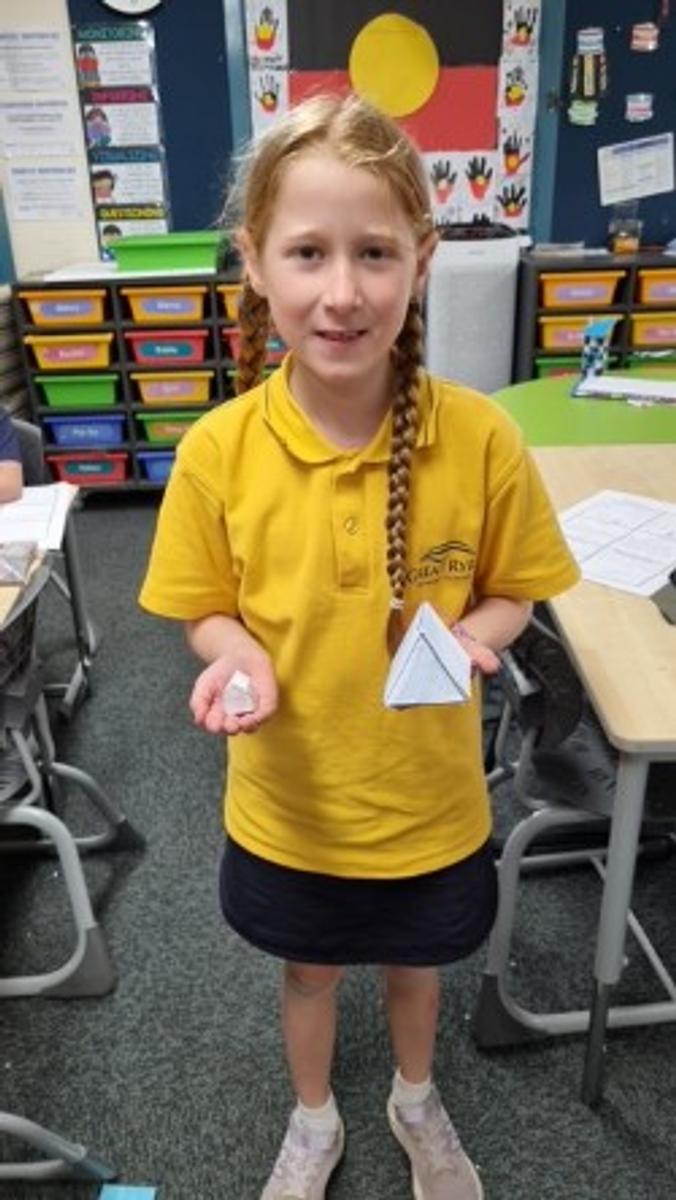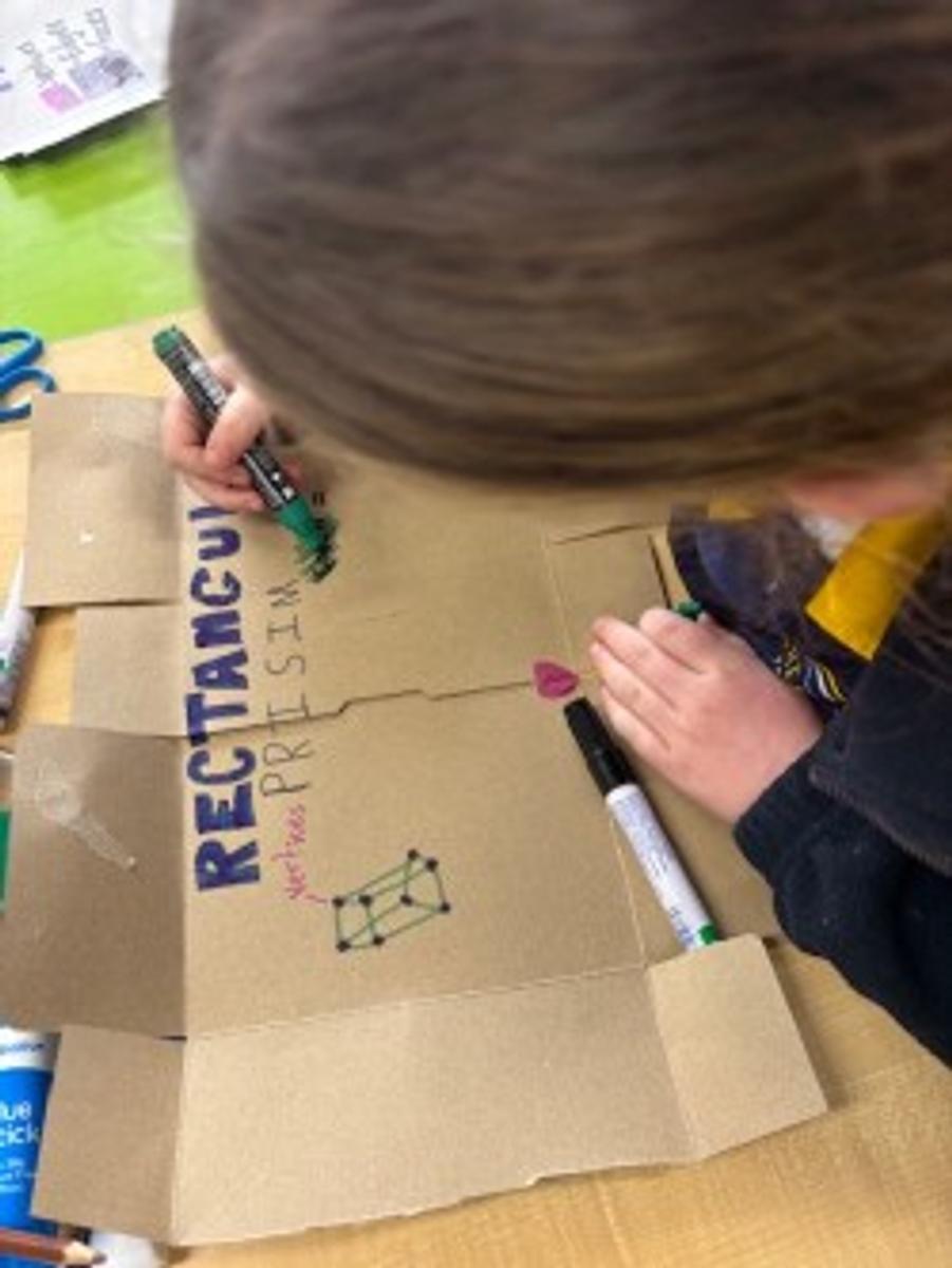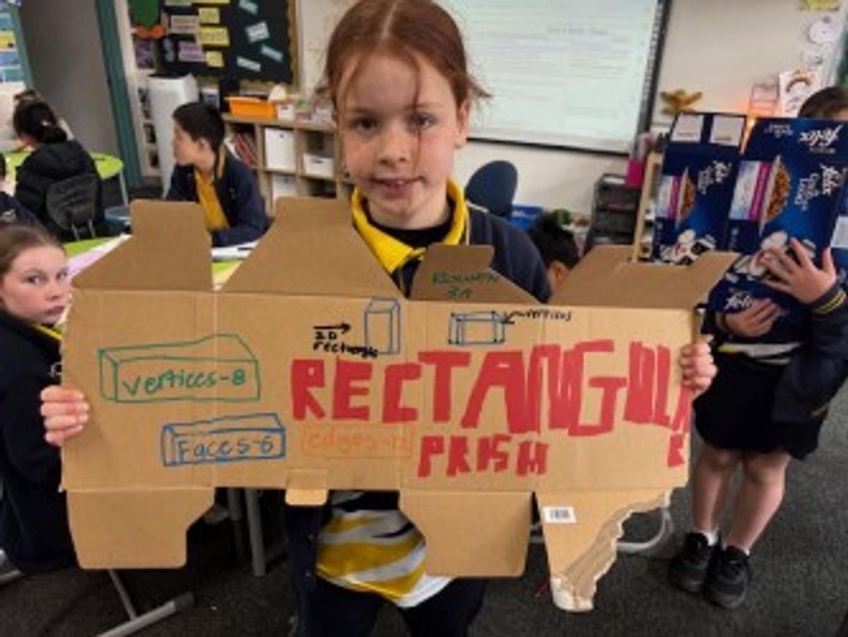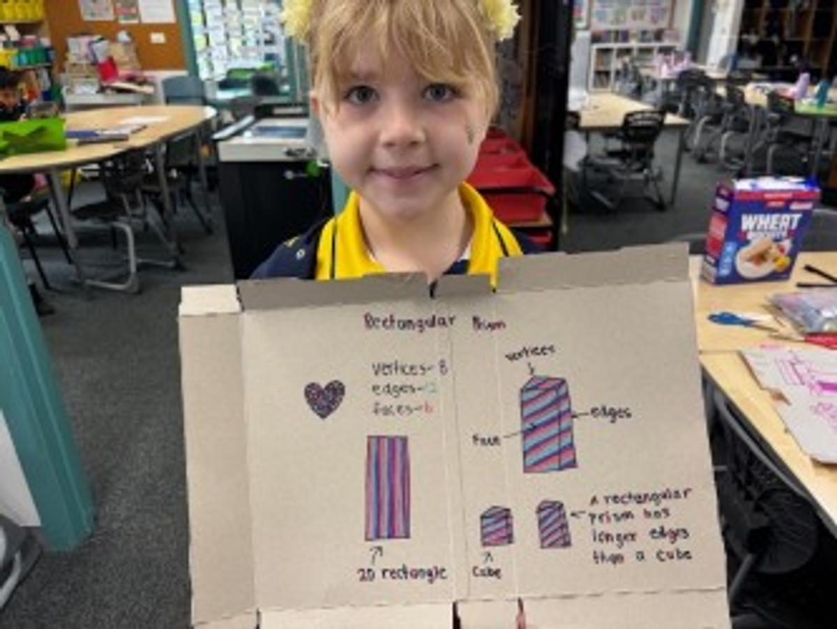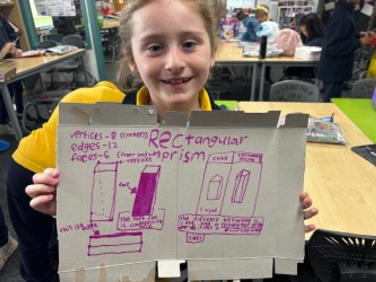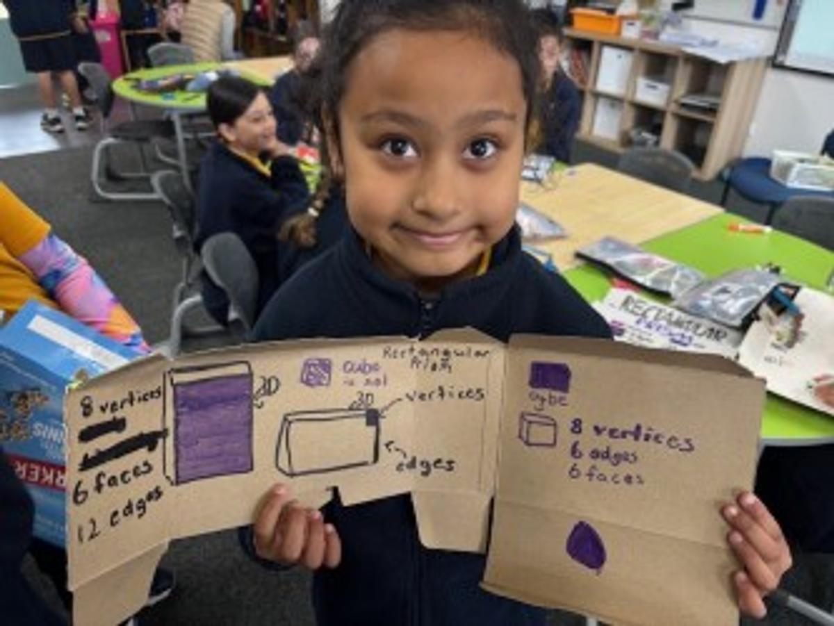 Mathematics – 3D Shapes In Maths, we’ve been investigating 3D shapes and their features—faces, edges, and vertices. A highlight was when students brought in real-life boxes from home to explore the concept of nets of prisms. By opening up the boxes, we were able to connect classroom learning to the real world and deepen their spatial understanding in a fun and interactive way.