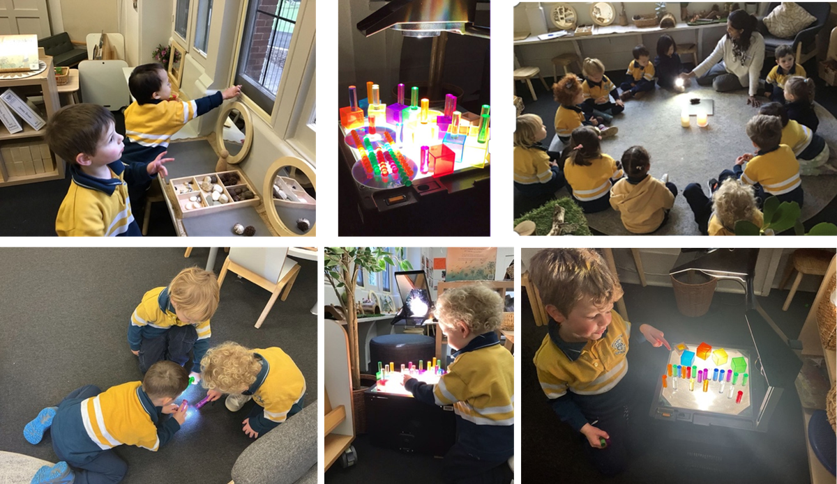 The Banksia Blue children have been deeply engaged in exploring the colourful blocks and transparent cylinders on the light table and the overhead projector. This experience has sparked a growing curiosity about how light behaves in our environment. Hence, our Term Three inquiry has focused on exploring the ‘Language of Light and Colour’.