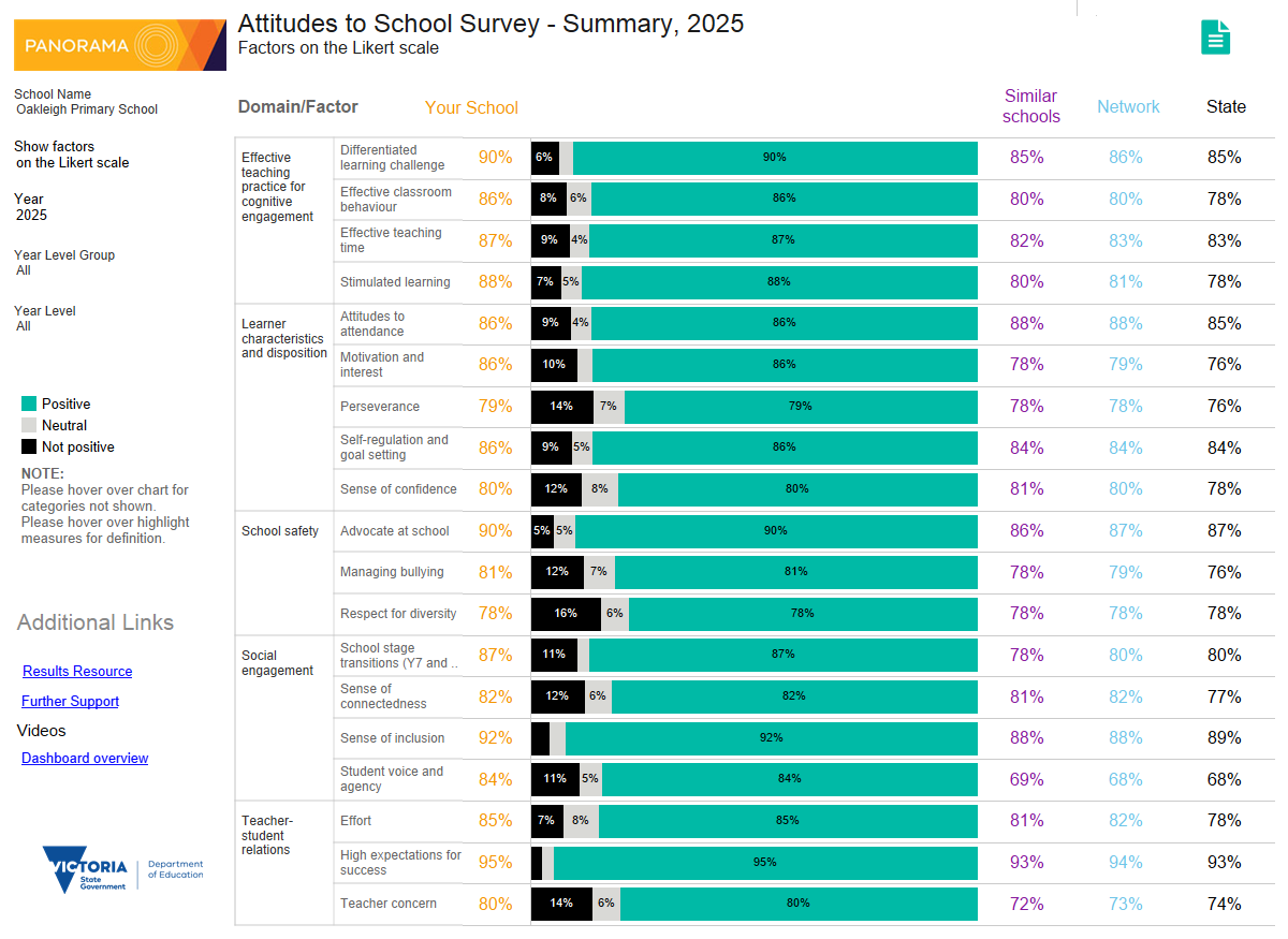 Our results are outstanding, achieving better than state, similar and like schools in most areas. This indicates, in the opinion of the students, that Oakleigh Primary School is a safe place and engaging for their education. Areas that we particularly excel in are differentiating learning challenge, effective teaching time, motivation and interest and student voice and agency.