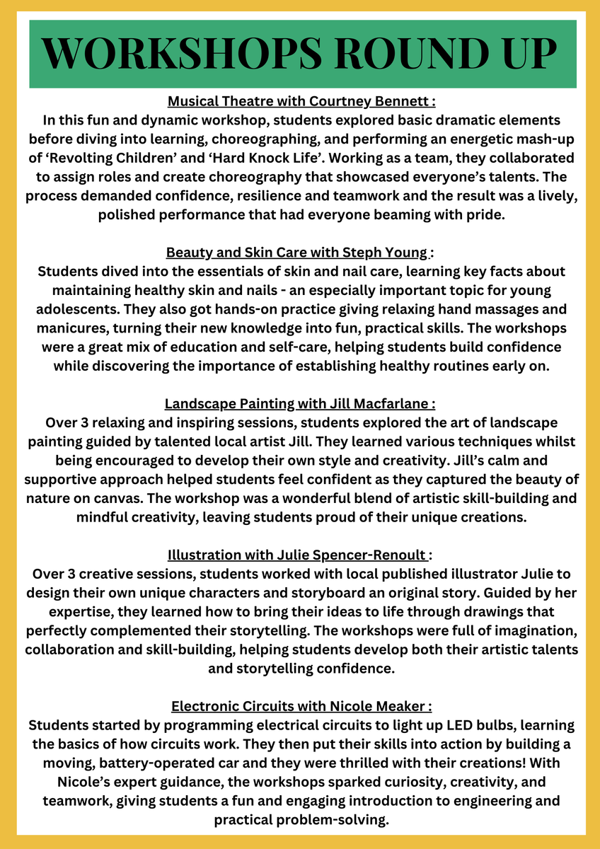 I loved doing the Musical Theatre workshop. We learnt about the 2 different types of voices that you can access in Musical Theatre. It was awesome to work with Courtney who has lots of experience in this area! She is so talented and allowed us the freedom to use our own creativity and choreograph the dances to our chosen songs which was really fun. – Bonnie 6T