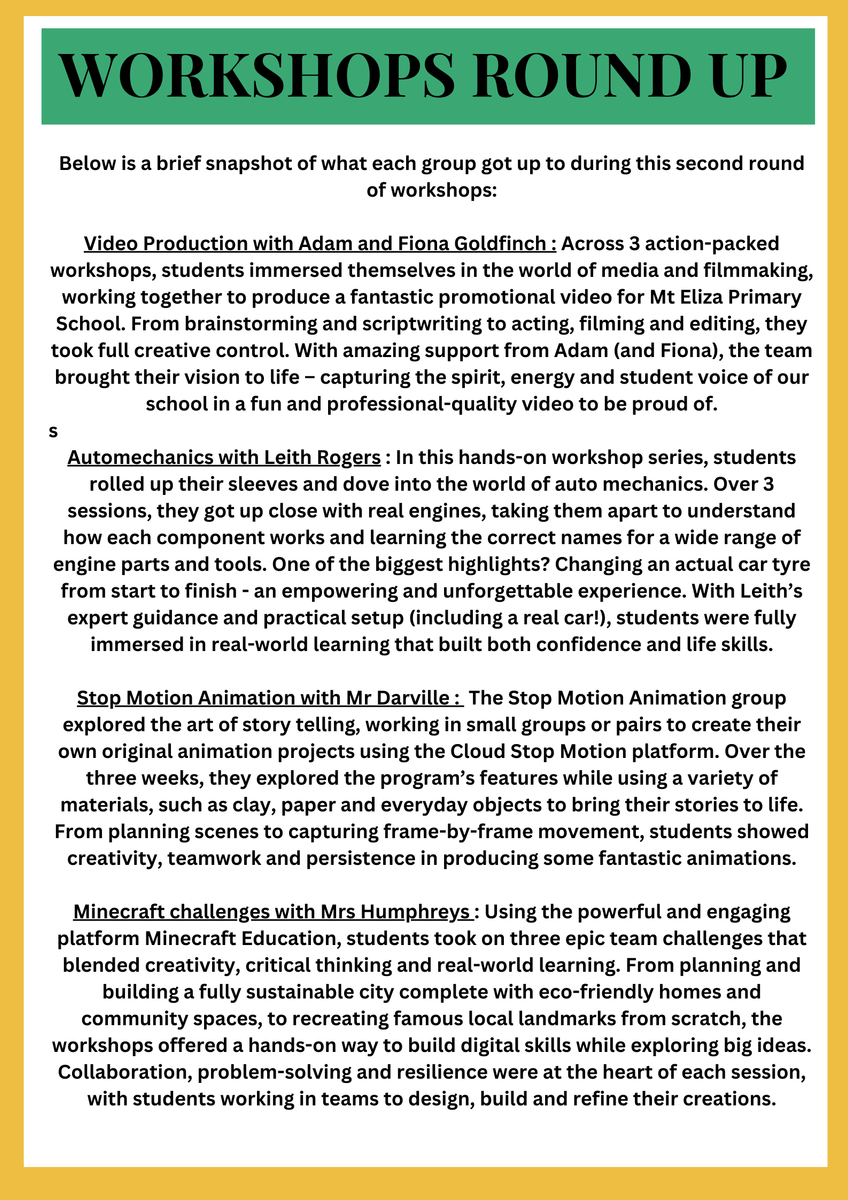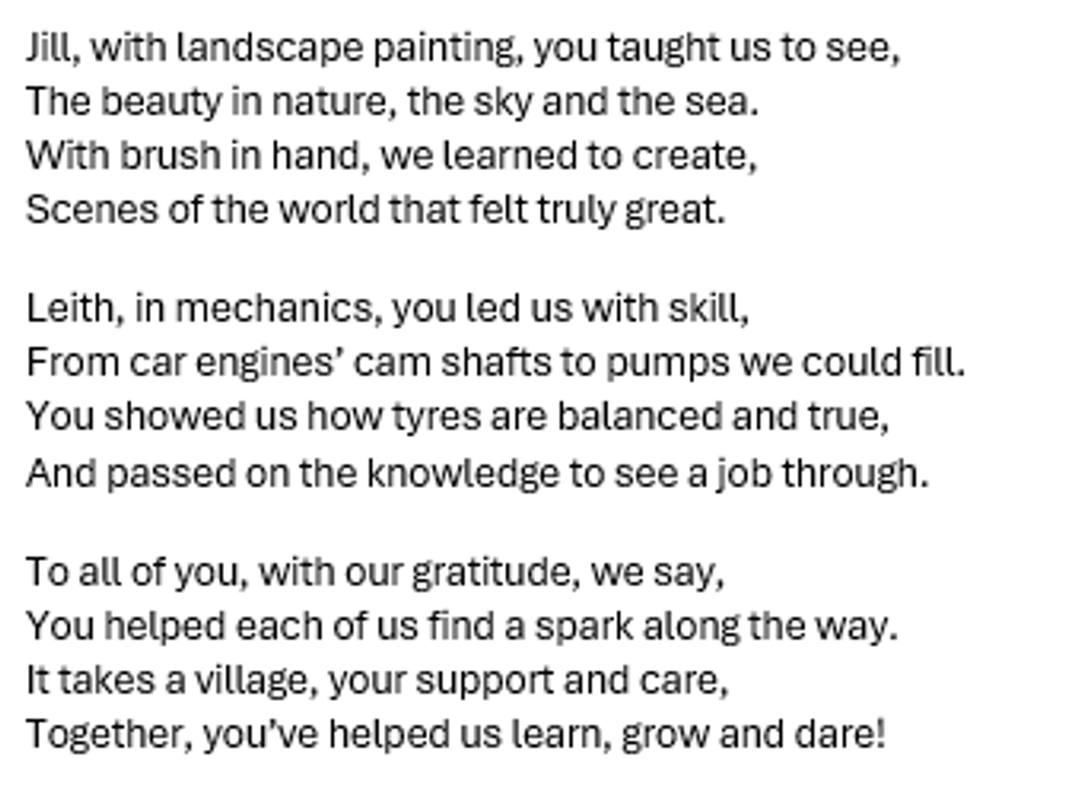 It was really helpful when we got to learn how to change a tyre and all about how engines work in the Auto Mechanics workshops. Leith was funny, engaging and knowledgeable. He didn’t do the work for us but he encouraged us all to give it a go ourselves which helped us all learn really effectively. I loved it! - Charlie L 6T