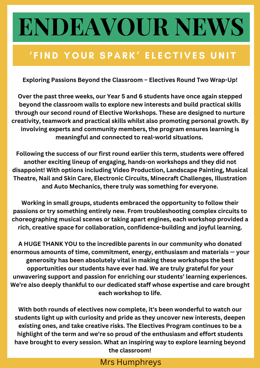 Photography was a really cool workshop – we got to plan, take and edit photos and I couldn’t believe how well they turned out. It was awesome that we were given responsibility to use the equipment ourselves and the freedom to take photos around the school of what we wanted. It was a great opportunity that we wouldn’t have had otherwise, if it wasn’t for the Endeavour program. - Bailey and Hubby 6B