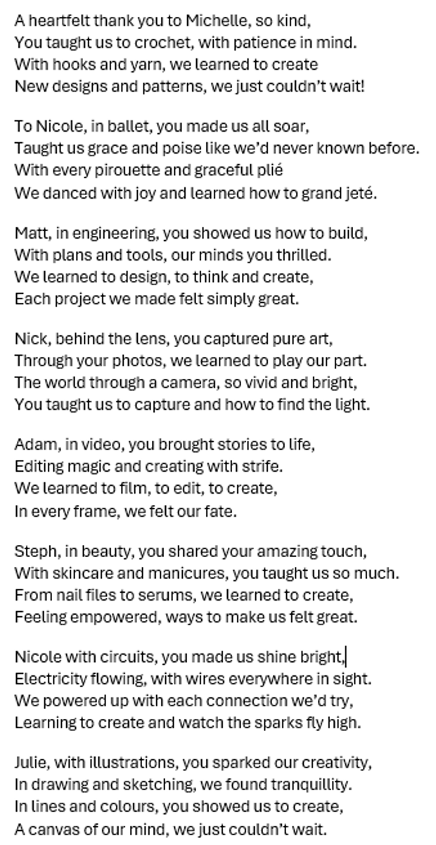 In the electrical circuits workshops with Nicole it was really cool to learn about all of the different electrical components and we even got to light up LED lights ourselves. I also really enjoyed making the electric cars and working fans in the final session as it was great to see our learning come to life in actual products. Thanks so much for such a fun and hands on workshop Nicole! - Teddy 6B