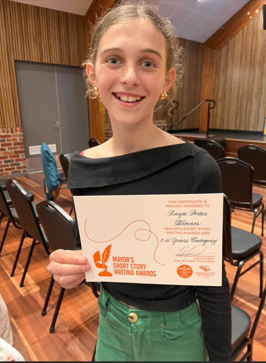 We’re thrilled to share that Raya Porter, a proud graduate from the Class of 2024, has been named a winner in the prestigious Mayor's Short Story Writing Awards 2025, triumphing over hundreds of applicants from across the Mornington Peninsula. This award celebrates excellence in short fiction, recognising young writers who demonstrate creativity, originality and a strong narrative voice. Raya’s achievement is a testament to her talent, hard work and passion for storytelling. Raya's short story 'What's Left Behind' was inspired by her trip to Indonesia and tells the story of 2 sisters left behind in the abandoned slums of Jakarta after the city’s relocation, relying solely on each other to survive. When a sudden tsunami strikes, they are swept into the chaos, clinging to hope, love and each other as they fight for survival.