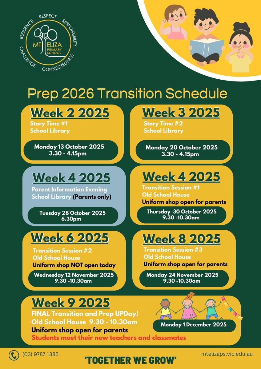 We are excited to begin the transition journey for our 2026 Prep students in term 4. Please see the Prep 2026 Transition Schedule below: