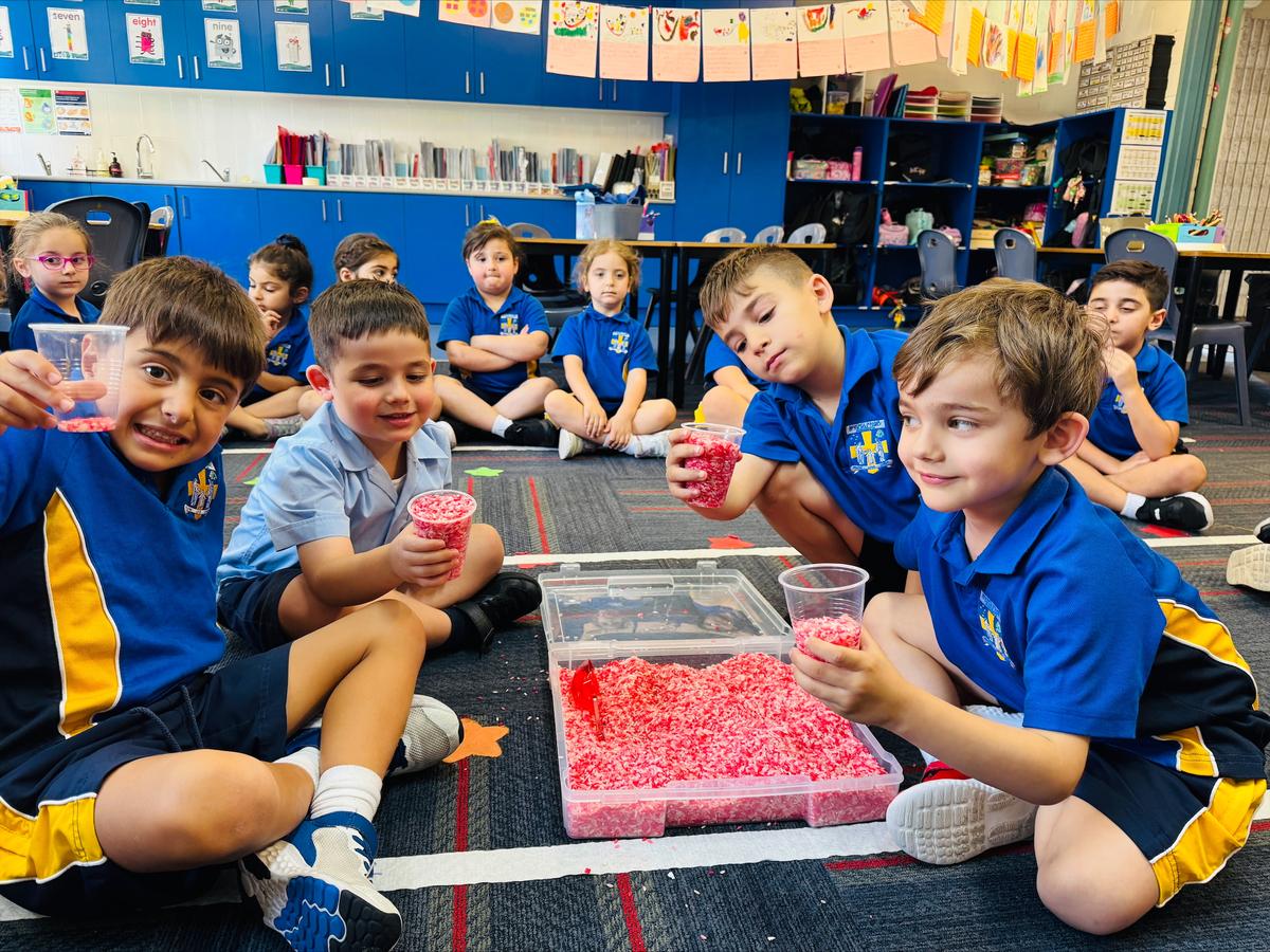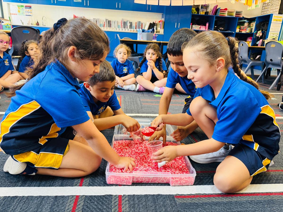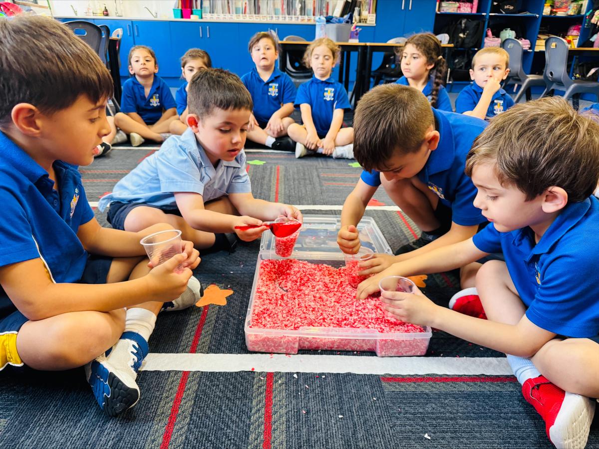 Kindy Red took turns measuring and using the terms nearly empty, half full, nearly full and full to describe the volume of coloured rice in plastic cups. It was pleasing to see the students engaged in the hands on learning experience.