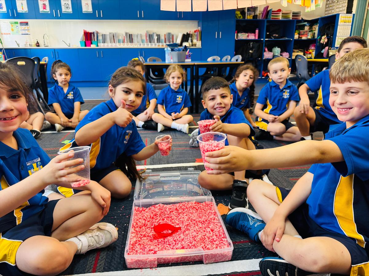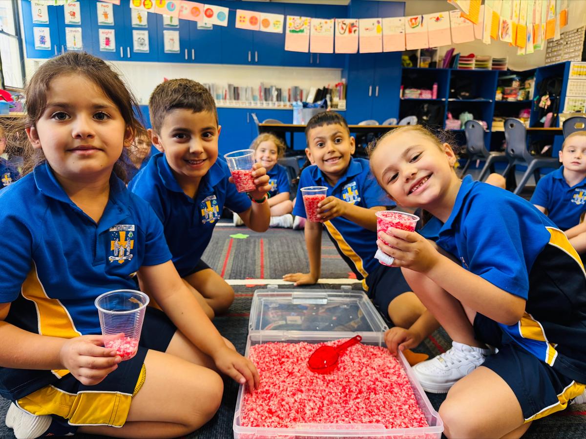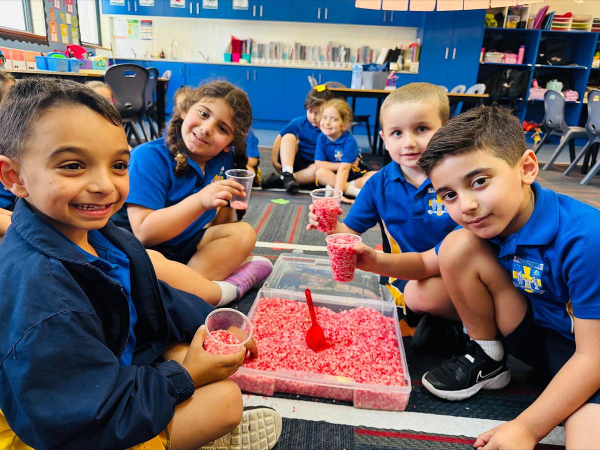 Kindy Red took turns measuring and using the terms nearly empty, half full, nearly full and full to describe the volume of coloured rice in plastic cups. It was pleasing to see the students engaged in the hands on learning experience.