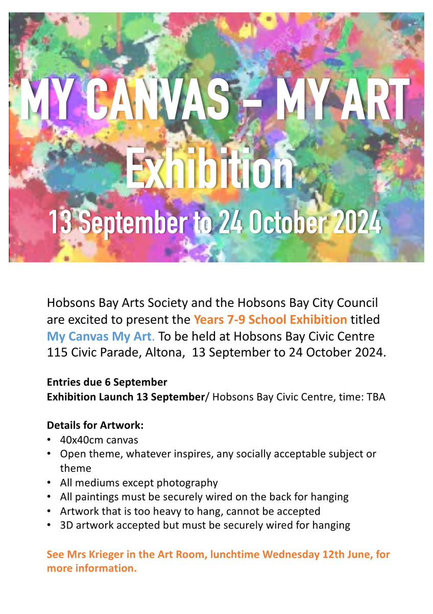 Any students in years 7-9 who wish to participate in the My Canvas My Art Exhibition. Please add the attached poster for details on how to enter.