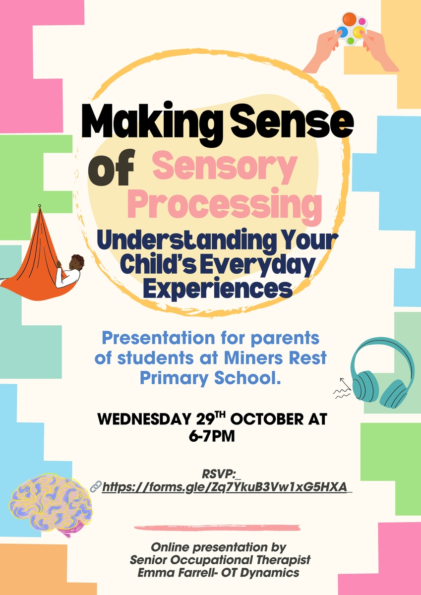 Miners Rest Primary School is also partnering with OT Dynamic to deliver an online session with Senior Occupational Therapist Emma Farrell. This session will focus on Making Sense of Sensory Processing – understanding your child’s everyday experience and is designed to support parents and carers in better understanding their child’s needs.