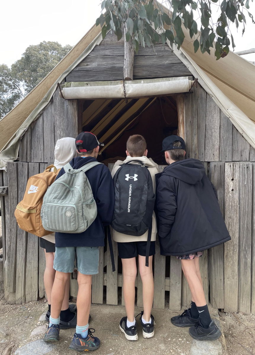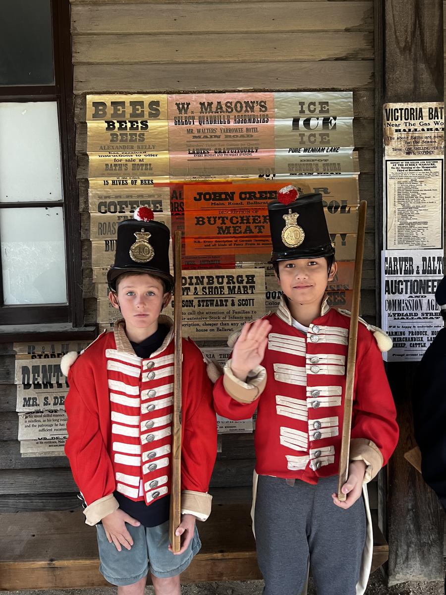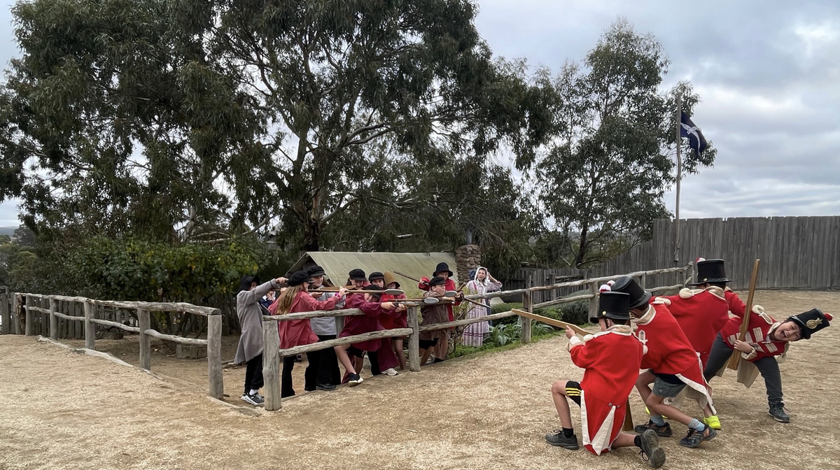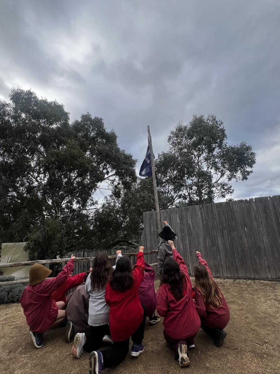 We walked from our cabins down to the eureka education session. We found out about the wars, redcoats and soldiers and we got to do a play and dress up in all the old styled clothes. I was a miner and got to hold a spear towards the end of the play. We all went inside and talked about the eureka flag and why its important. - Tatum