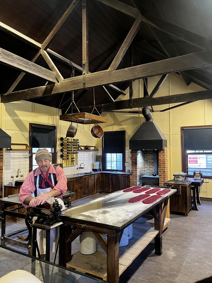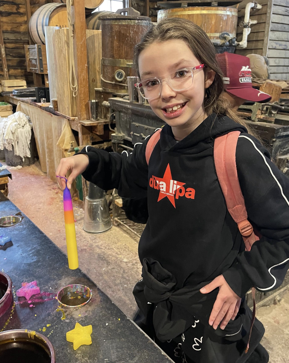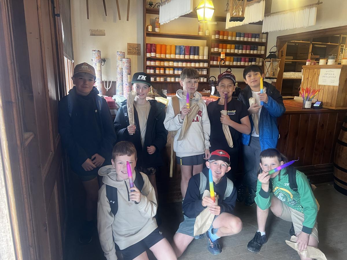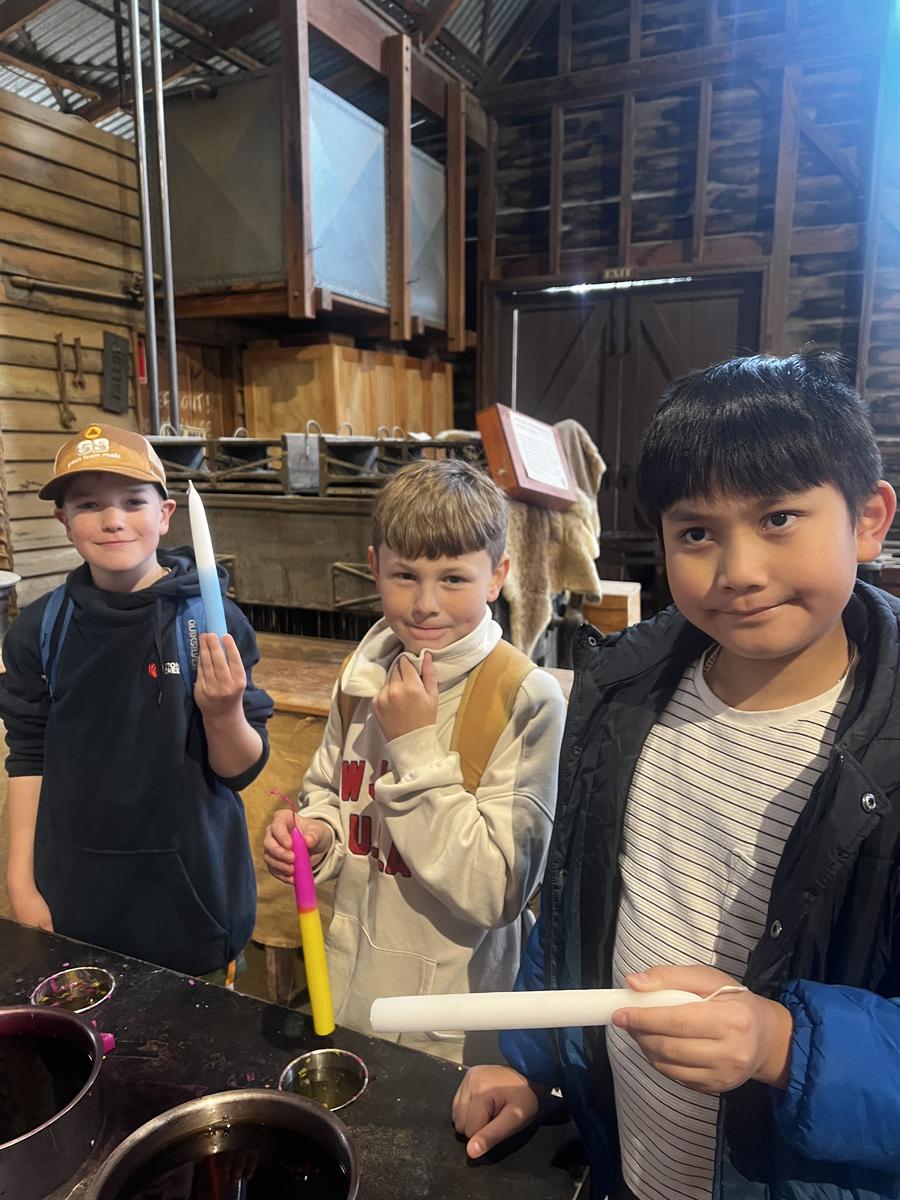 As I walked through the door to the confectionary, I smelled the smell of boiled sugar, glucose, water and whatever else was in the copper bowl over the stove. Last day of camp and I wondered what the ride home will be like? But then the lolly maker man entered the room, first he let the mixture sit for a little longer while giving a run down of the history of the confectionary. Then he put red die into the mixture and laid it out onto the table. More lolly making people, two, came in and started dipping apples into toffee. Then the first man separated the mixture and put it through the machine that made the mixture into the semi-final product. - Ivy
