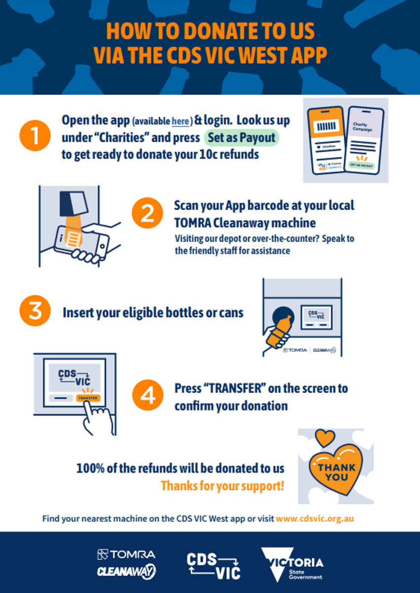 The Altona College Recycling Club would love your support in collecting and recycling eligible drink containers (cans/bottles/juice boxes) and helping our College Fundraising Committee continue to raise funds for our school. If you would like to support, you can drop off any collectables in the 3/4 portables and P-2 building or download the CDS App and add Altona College Recycling Club as your desired community partner.