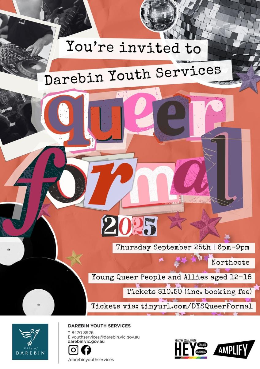 Darebin Youth Services is staging its first ever Queer Formal at Northcote Town Hall on Thursday, 25 September. This is a drug, alcohol, vape and smoke-free event for Queer Young People and Allies aged 12-18 that live, work, play or are connected to the city of Darebin.