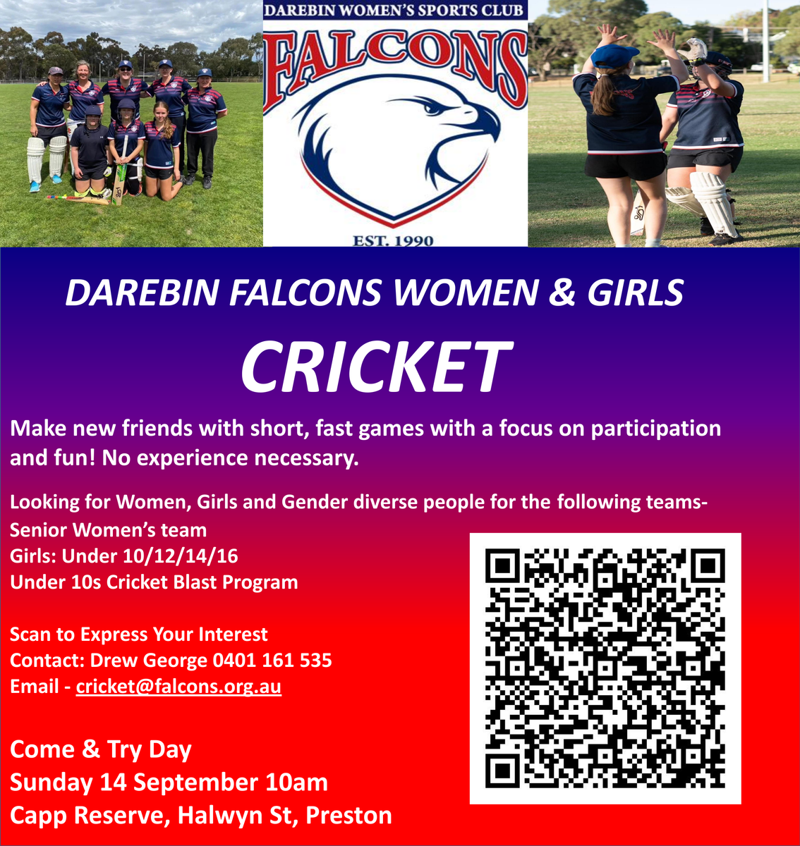The Darebin Falcons are inviting girls of all ages to be a part of their growing cricket community. Whether you're new to the game or a seasoned player, there's a team for everyone.