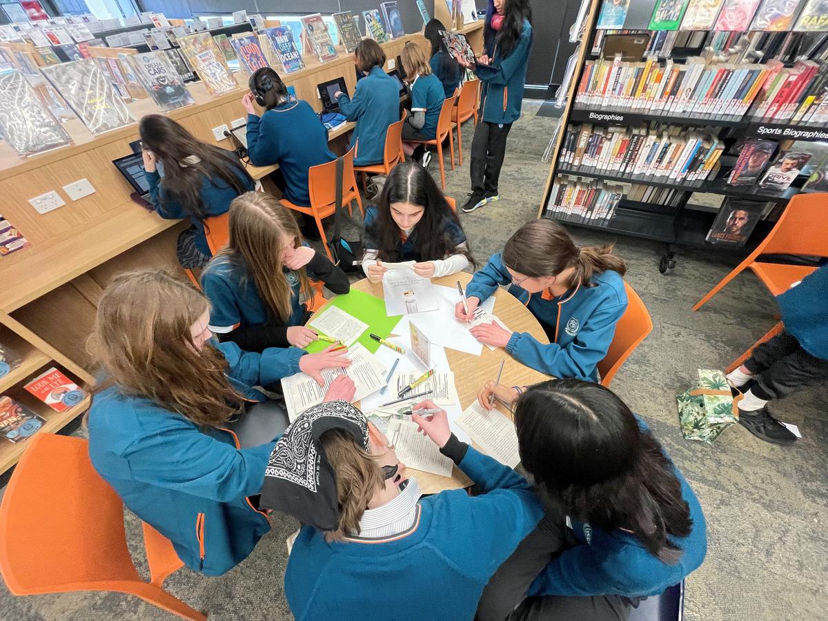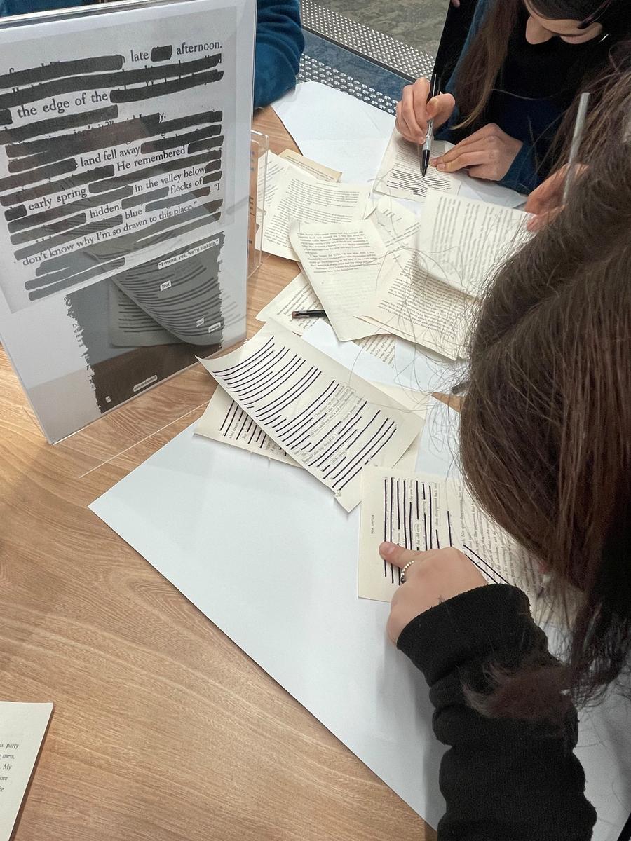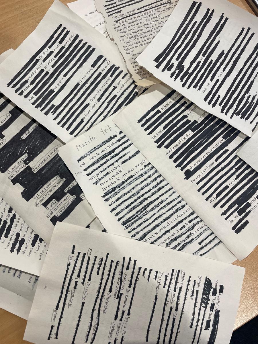 Students also got creative with a blackout poetry activity, turning pages from damaged library books into original pieces of word art. Shout-outs to Year 8 students Victoria, Lucy and Liv for their impressive poems. These three all won a library prize for their efforts.