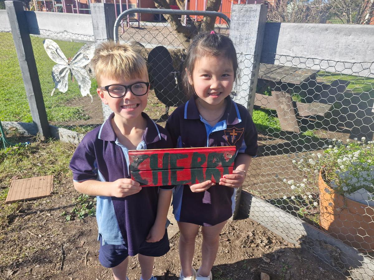 As the Foundation students have been at school for over 100 days, and with the 3-6 students off in the City, F-2 thought it was high time they rule the school! After some heavy consultation rounds, they wore casual clothes and walked into decorated doorways before beginning their special day. Starting with their usual Art lesson, they then played some sports games with Miss Gen before recess.