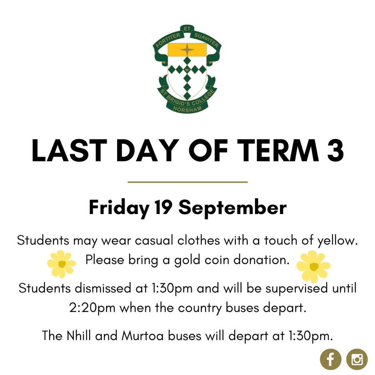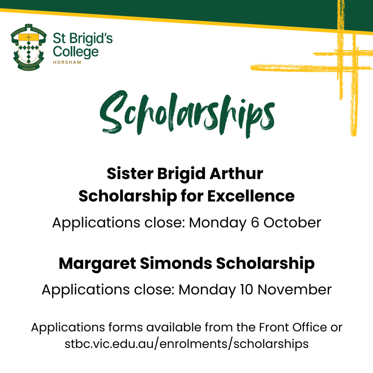 A reminder to students and families that applications are open for the Sister Brigid Arthur Scholarship for Excellence and the Margaret Simonds Scholarship for the 2026 school year.