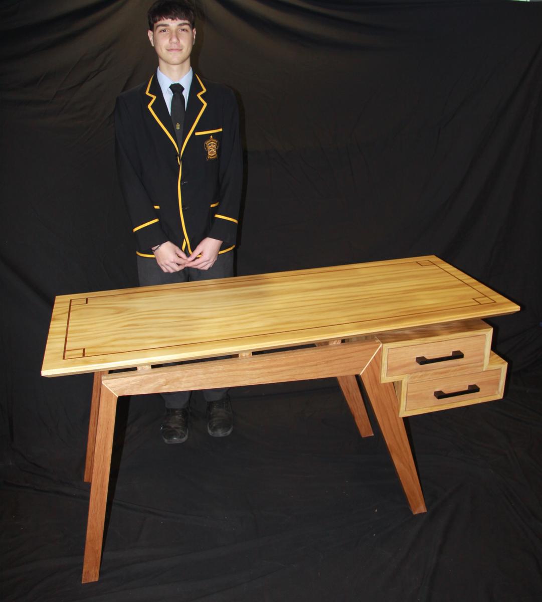 For my 2025 Major Work Project, I designed and manufactured a medium-sized desk with multiple drawers for storage and a long, flat surface to hold a monitor and other items. I aimed to challenge myself and apply the skills I have developed through previous timber projects to create my best work yet. The desk is replacing an old, small, and outdated one, currently used in the study room that both me and my brother use daily. I made a dual-purpose desk with designated areas for both of us, ensuring tidiness and efficient use of space. I selected a high-quality hardwood, Blackbutt, and an aesthetic soft wood, Accoya, to prevent dents and damage from regular use while creating an aesthetic look for a professional design. I used a Danish Oil finish to add a protective layer to ensure the desk is durable while enhancing the grain of the timber to create an aesthetic look. I am happy with how to project turned out as it showcases the development of my timber skills since starting the subject.