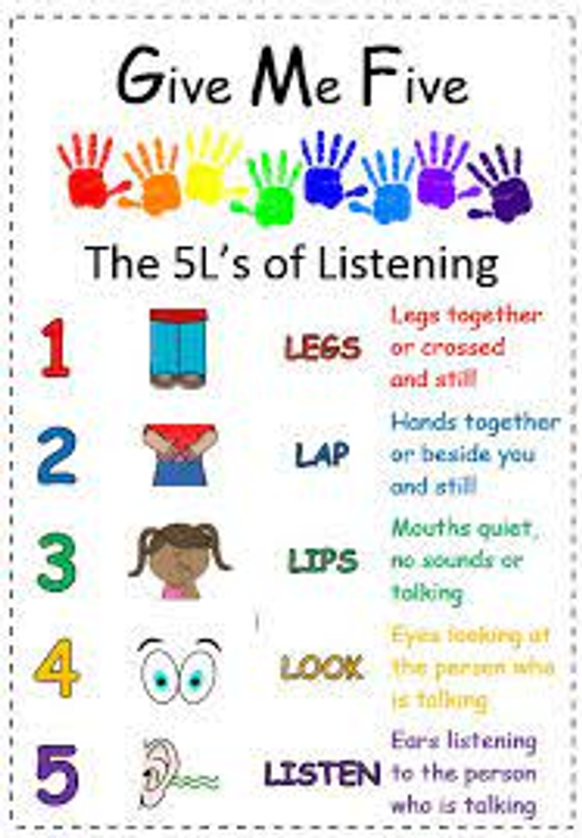 If your child is restless or fidgety then talk about the parts of their body that they need to use to let you know that they are listening. That is….. keeping their hand and feet still, keeping their bottom still, turning their head towards the listener, looking at the person speaking (eyes), keeping their mouth closed, having their ears open and their brain switched on to what the other person is saying