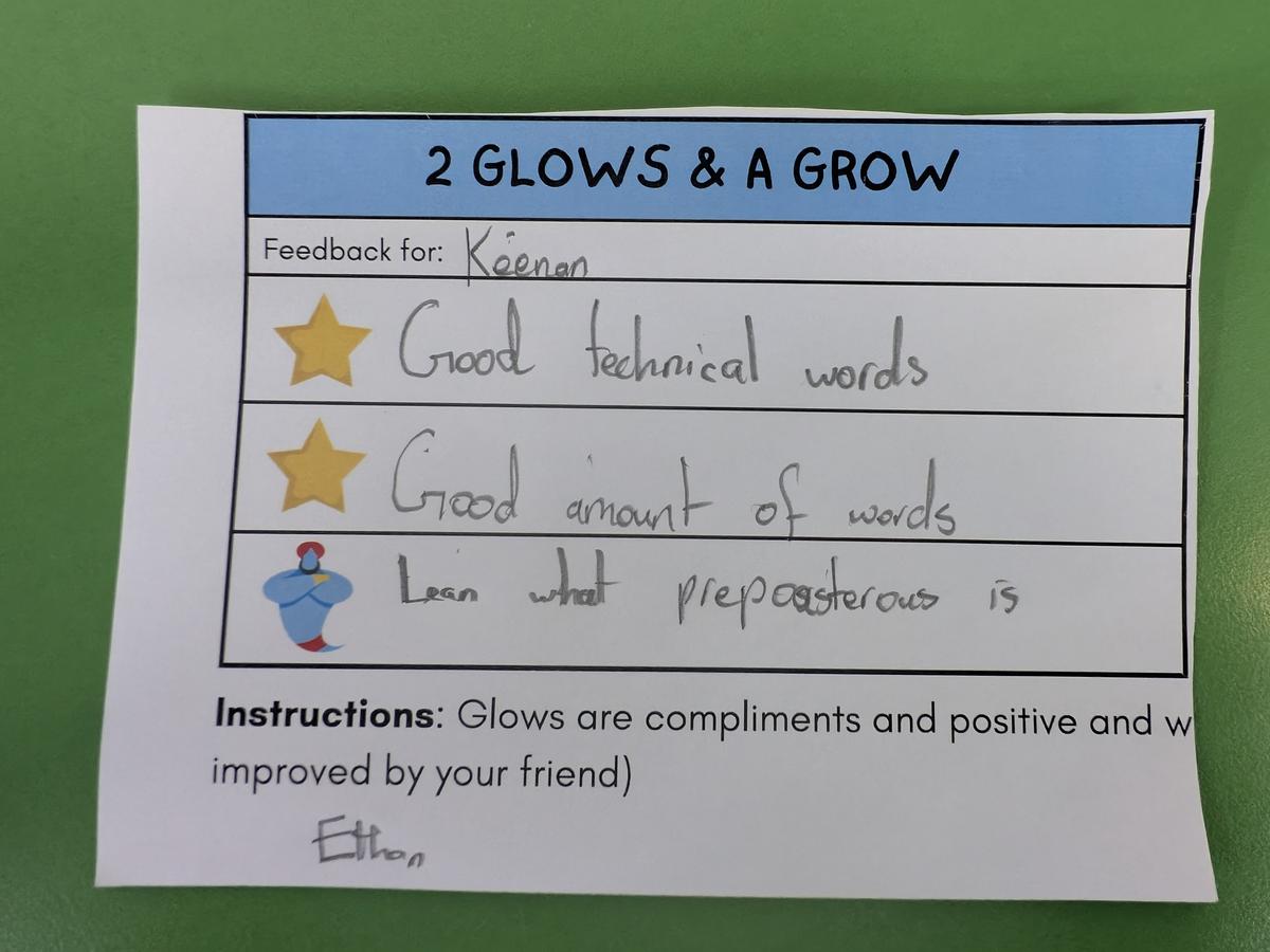 This term, students learned a simple feedback routine called Two Glows and a Grow: share two specific positives (“glows”) and one clear suggestion (“grow”). We modelled what good feedback sounds like—kind, specific, and about the work (not the person)—and practised with sentence stems such as “A strength is… because…” and “A next step could be…”. Students used the routine in writing, maths explanations, and art, then acted on the “grow” during quick revision time.