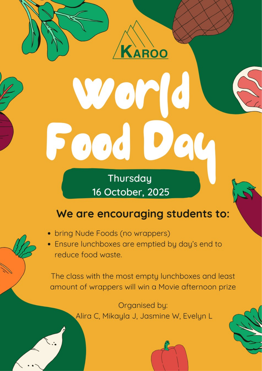 This Thursday, 16 October, is World Food Day. Four of our amazing Grade 5 students have come together to raise awareness about food wastage and rubbish. To support their initiative, we ask all students to: