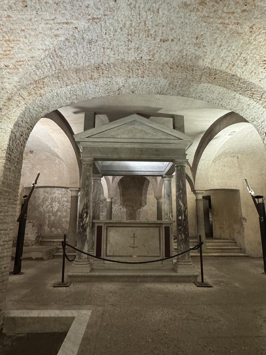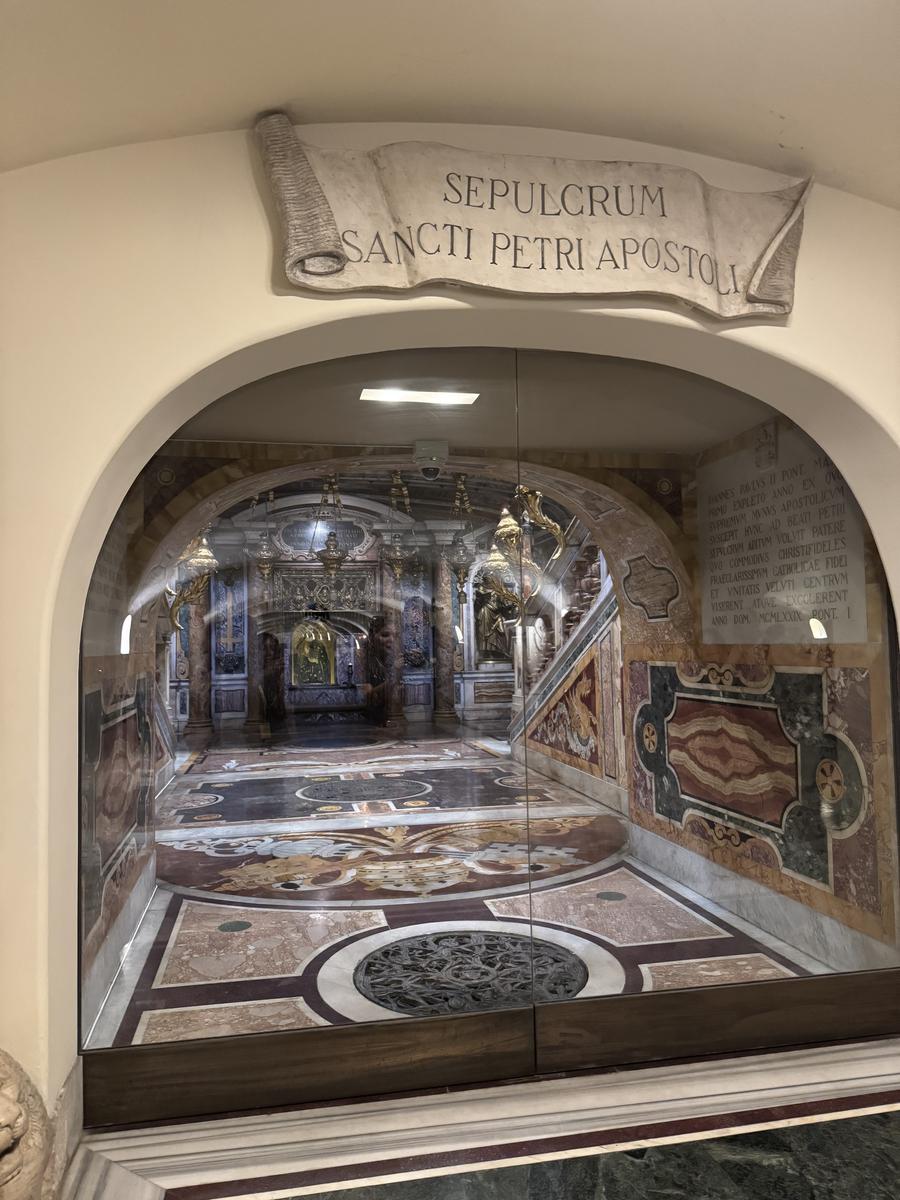Beneath the grand dome of St Peter’s Basilica, we were blessed to visit one of the most sacred places in all of Christianity, the burial site of St Peter himself. Fr Gallacher and Fr Michael Buck reminded us to take a moment to reflect on the significance of this sacred place and led us in prayer. This humble place, hidden beneath the splendour above, is the true heart of the Basilica. It reminds us that the Church was built not only on Peter’s faith, but also on his sacrifice. We were invited into a moment of deep reverence and connection, to touch, in spirit, the very foundation of our faith and to give thanks for the courage of the first shepherd who followed Christ to the end. As pilgrims of hope, we journeyed together recognising that we, too, shared in Peter’s legacy - to live with faith, to build unity, and to bring hope into the world. Our time in that holy place strengthened our hearts, reminding us that the same Lord who called Peter by name had also called each of us to follow Him with courage and trust. No photos were permitted inside this sacred site, however you can see below the place where St Peter was killed, the entrance to the tomb and the shrine inside the main basilica.