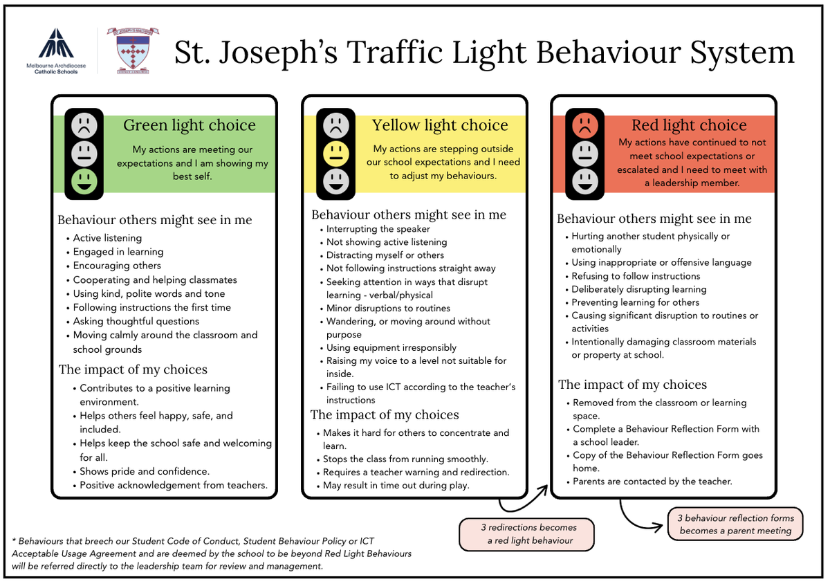 A key part of this refresh is our new Traffic Light Behaviour System. This chart helps students identify the choices that keep everyone in the 'green zone' for learning and recognise when behaviours might move them into the 'yellow' or 'red' zones. This approach prioritises learning, encouraging students to reflect on how their decisions help or hinder their own development and the positive atmosphere for everyone.