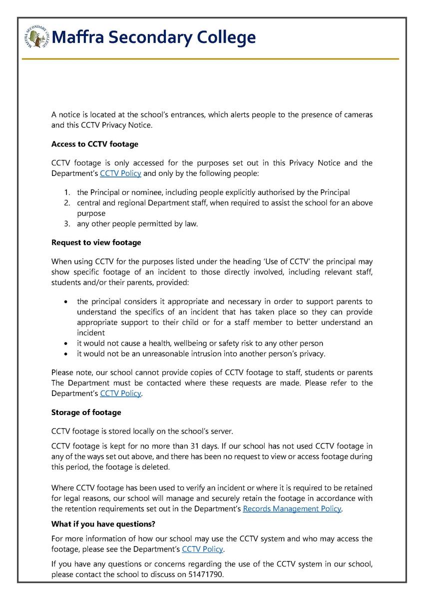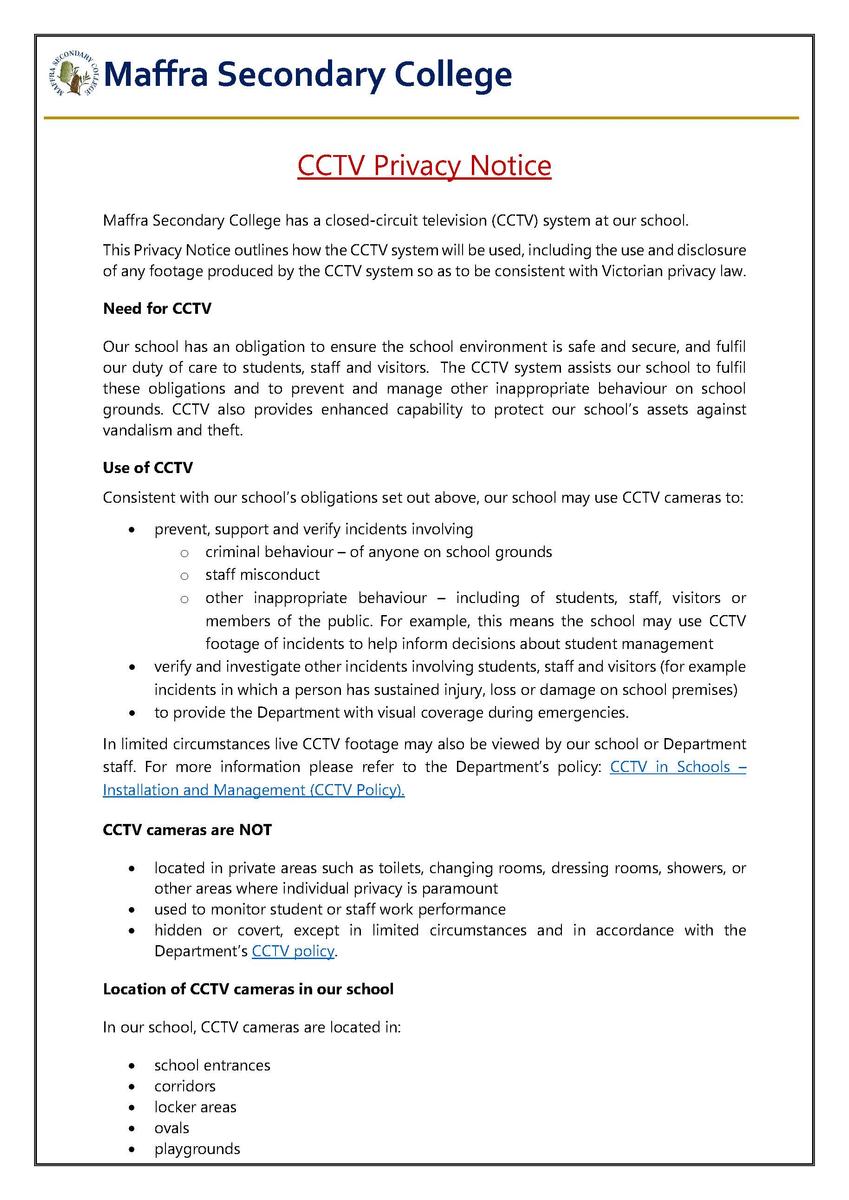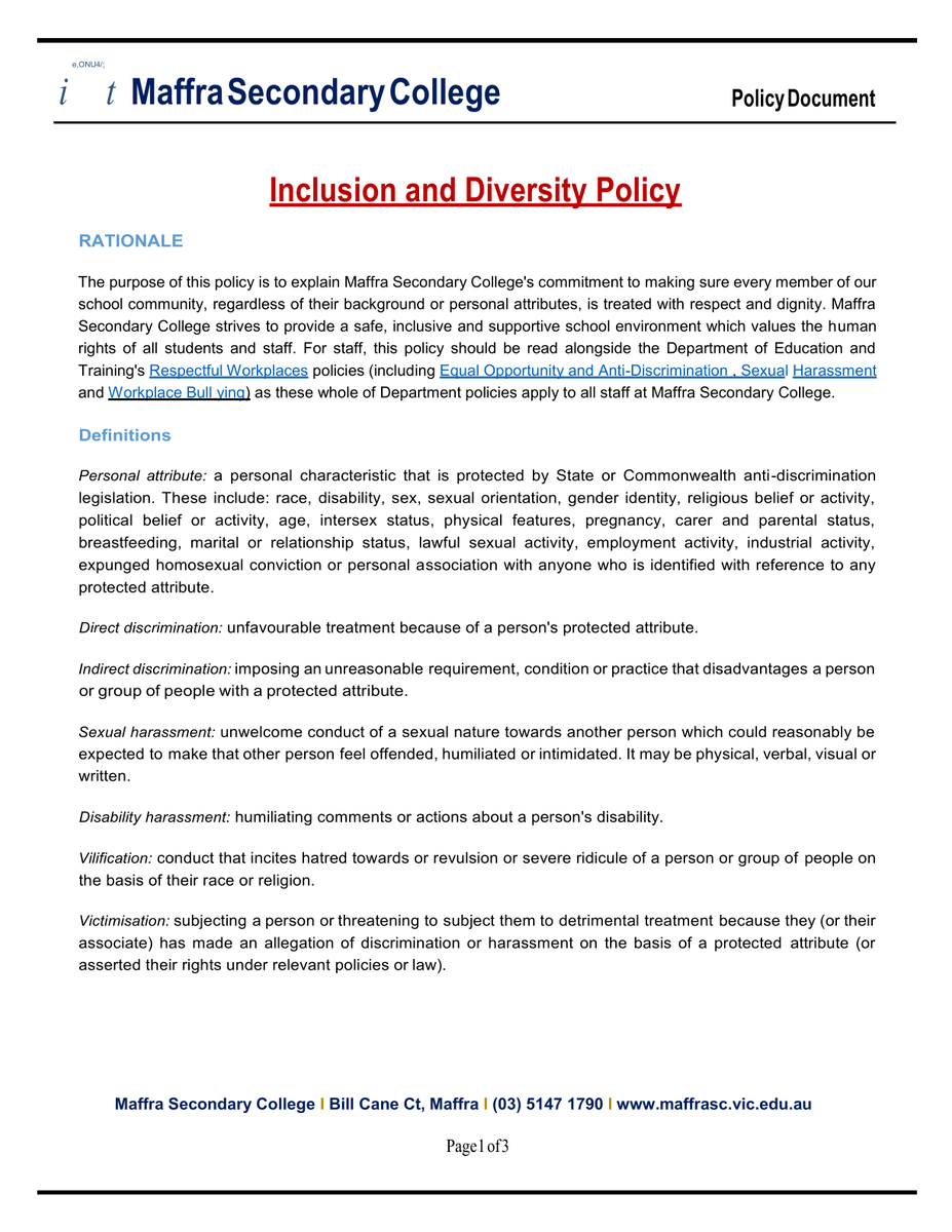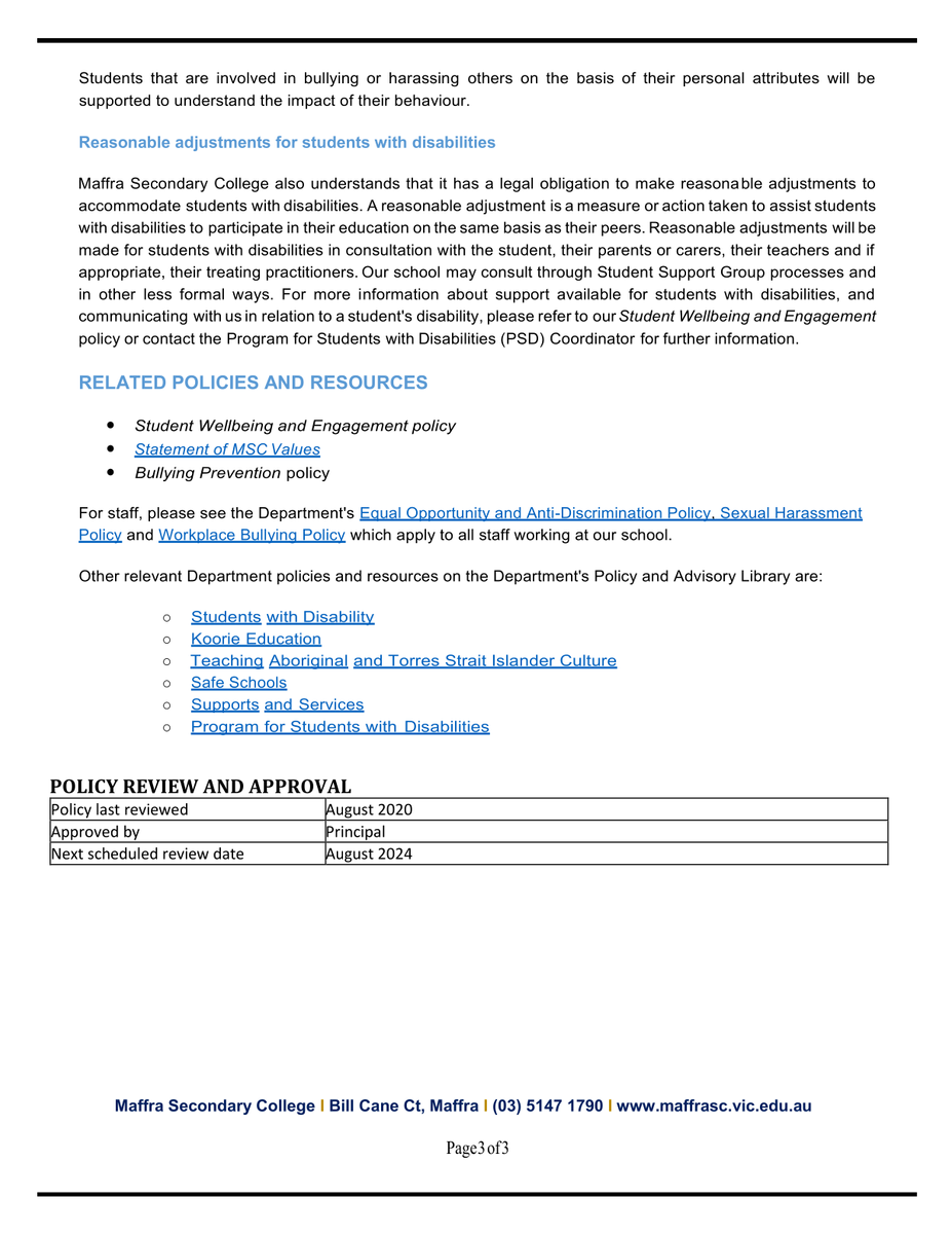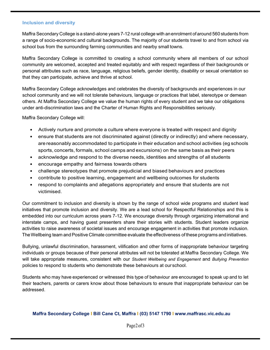 Our school policies are updated regularly in line with the Department of Education minimum standards. Our local school policies can be accessed via our school website at https://www.maffrasc.vic.edu.au/page/8/Policies-&-Reports, and we are also publishing a policy each time our newsletter is released. We invite input, feedback and/or comments on our school policies from students, staff families and community members. If you have any feedback, or would like input, please contact the main office on 5147 1790. If you are interested in having more of a say in how our school operates, you might consider joining school council as a parent or community member.