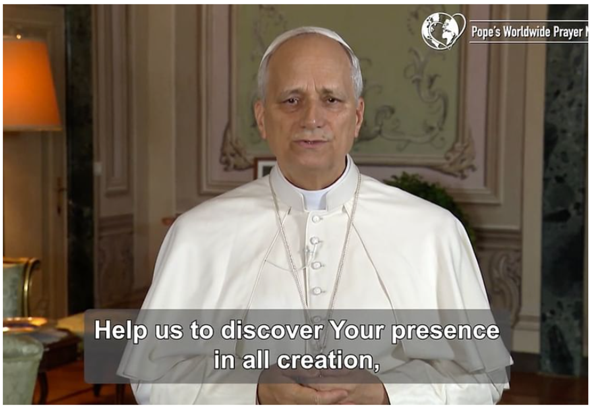 Pope Leo XIV, recording a video in the Villa Barberini at Castel Gandolfo, Italy, recites a prayer asking God to help people discover his presence in creation. (Photo: CNS/screen grab, Pope’s Worldwide Prayer Network.)