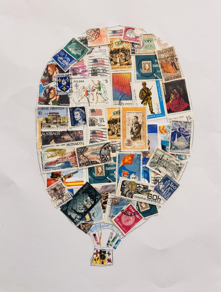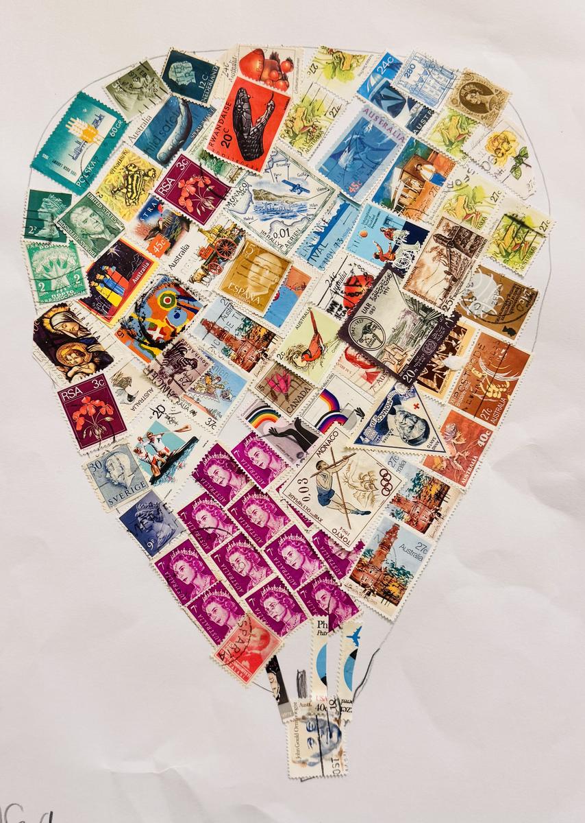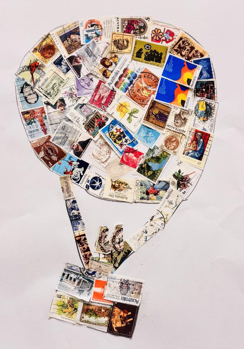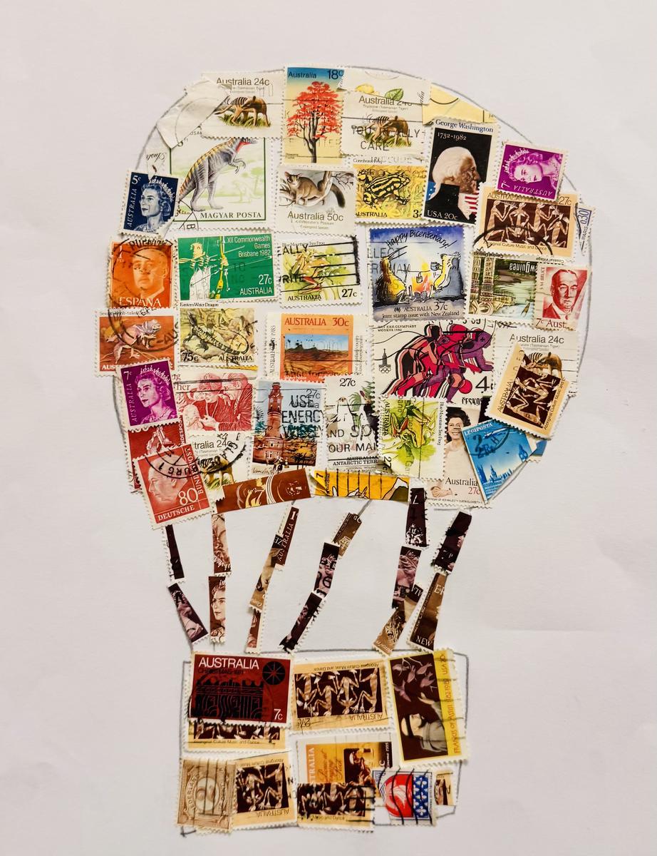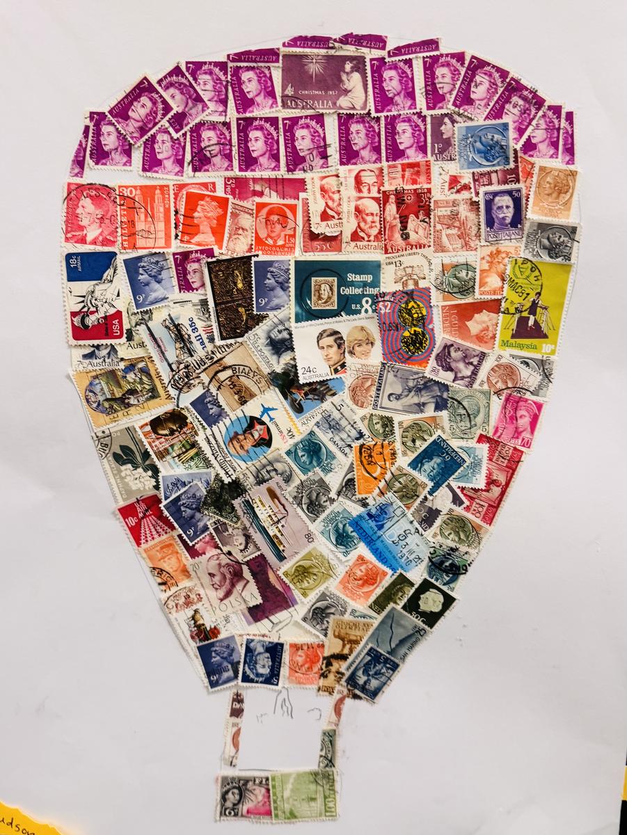 Thanks to lovely Heather who works in our canteen! She has given us most fabulous collection of postage stamps to upcycle into beautiful artworks. The children loved sorting through them - we found endangered animals, Olympics, the Queen, flowers, soldiers and mini works of art. Experimenting with collage techniques, the students used the stamps to create a hot air balloon artwork.
