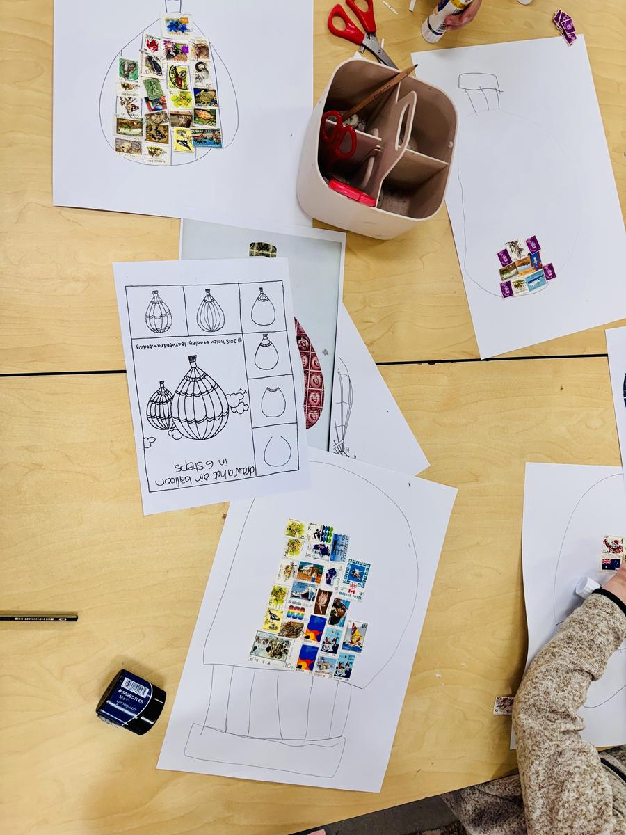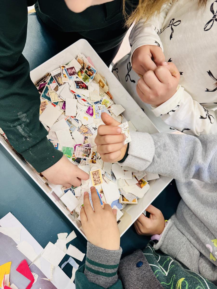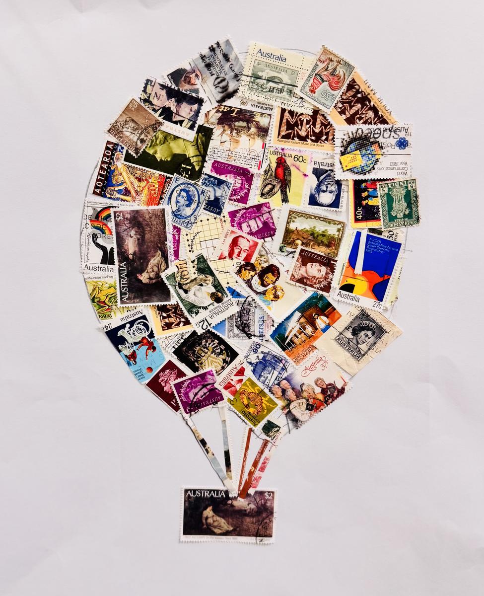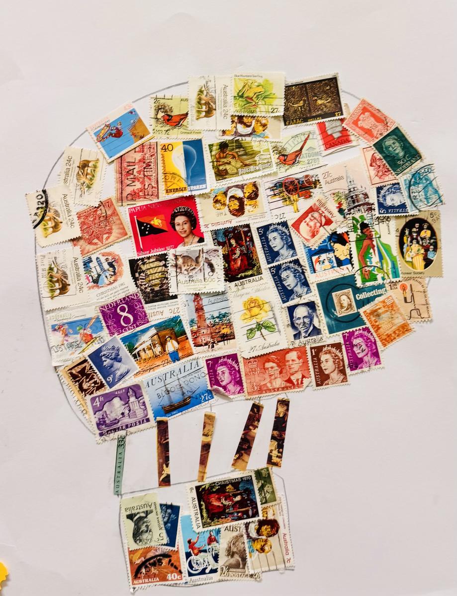 Thanks to lovely Heather who works in our canteen! She has given us most fabulous collection of postage stamps to upcycle into beautiful artworks. The children loved sorting through them - we found endangered animals, Olympics, the Queen, flowers, soldiers and mini works of art. Experimenting with collage techniques, the students used the stamps to create a hot air balloon artwork.