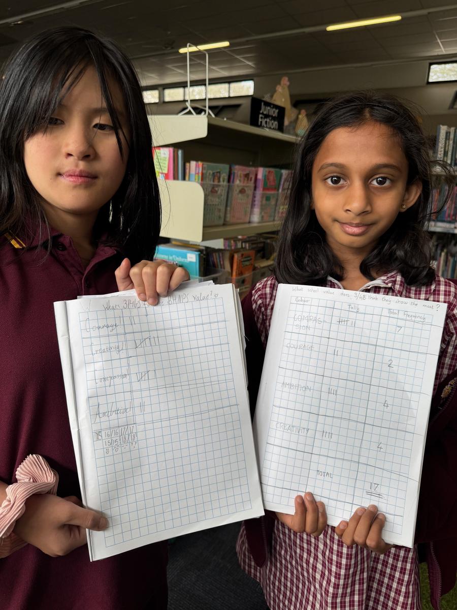 Students in 3/4B were learning about statistics this week; especially how to refine their questions to gather information they want or need. Akshara and Ivy were eager to share their work with me, as they had surveyed students regarding some specific questions about our school values.