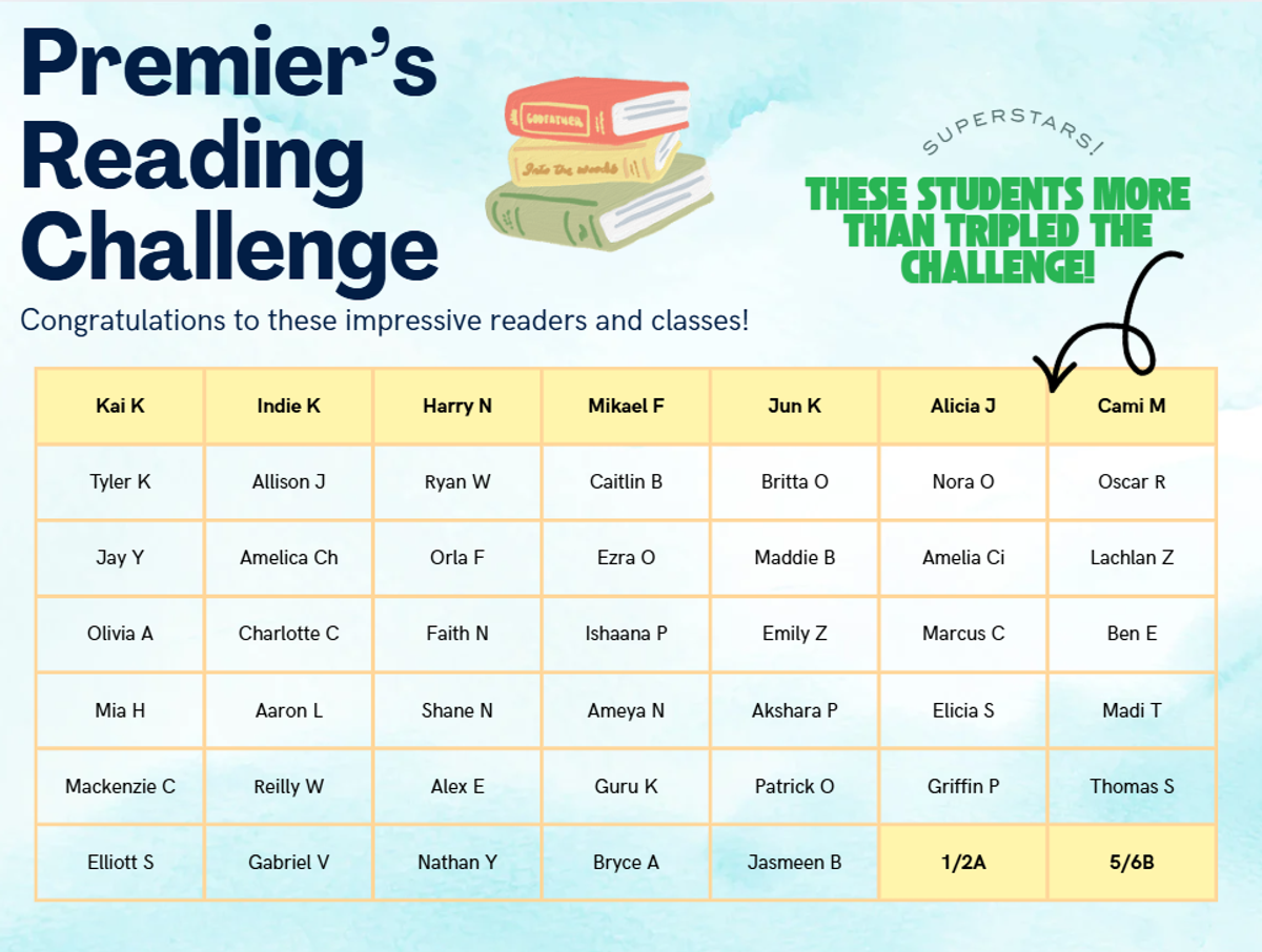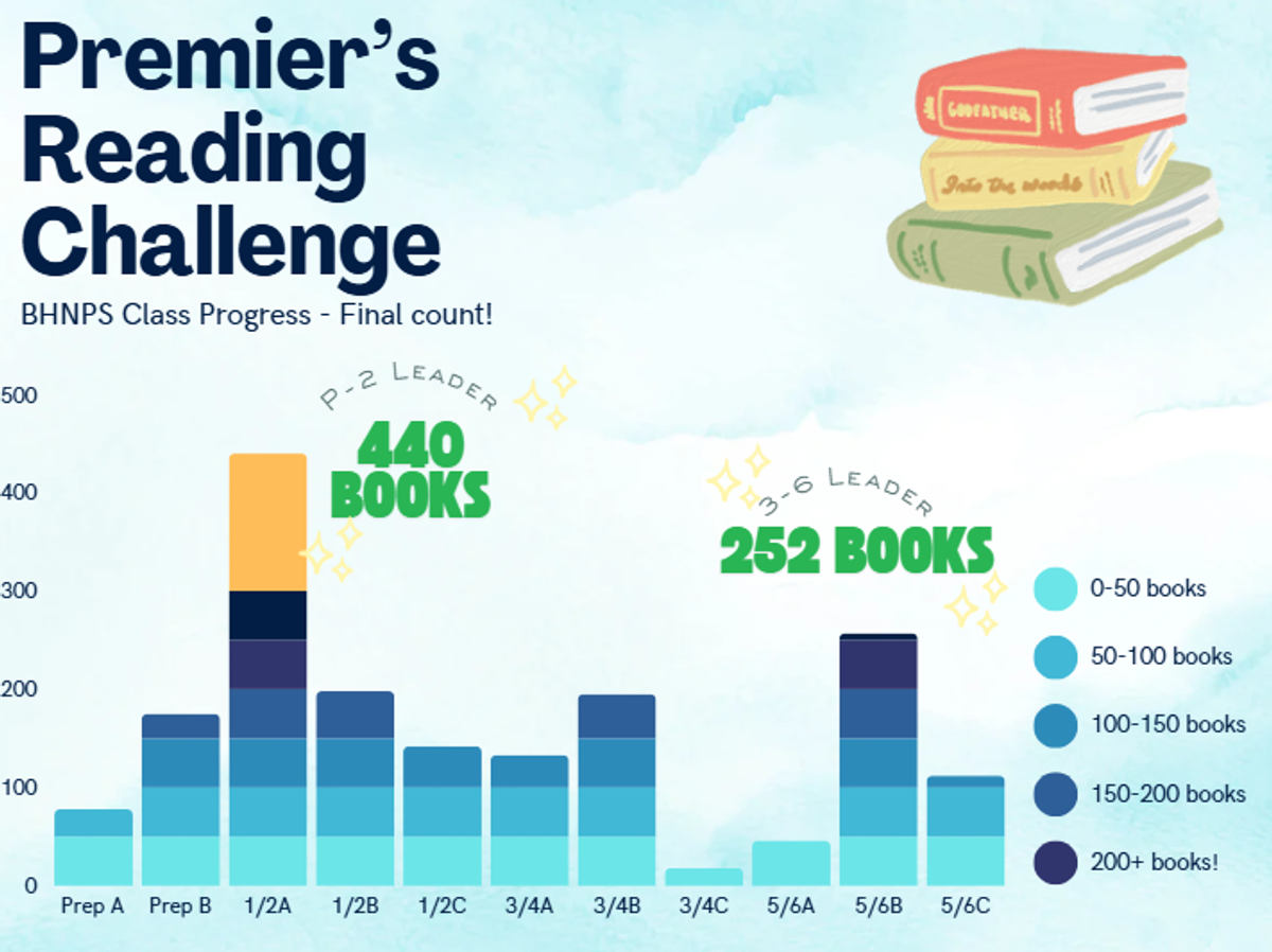 The Premier's Reading Challenge has finished! Congratulations to all the students who participated eagerly, reading their hearts out and achieving the challenge. An impressive 47 students from around the school completed the challenge. This means from Prep-2, these students read at least 20 'Challenge' books and 10 'Choice' books, while in Years 3-6, students read at least 10 'Challenge' books and 5 'Choice' books. Congratulations to all the students who completed the challenge and everyone that had a go.