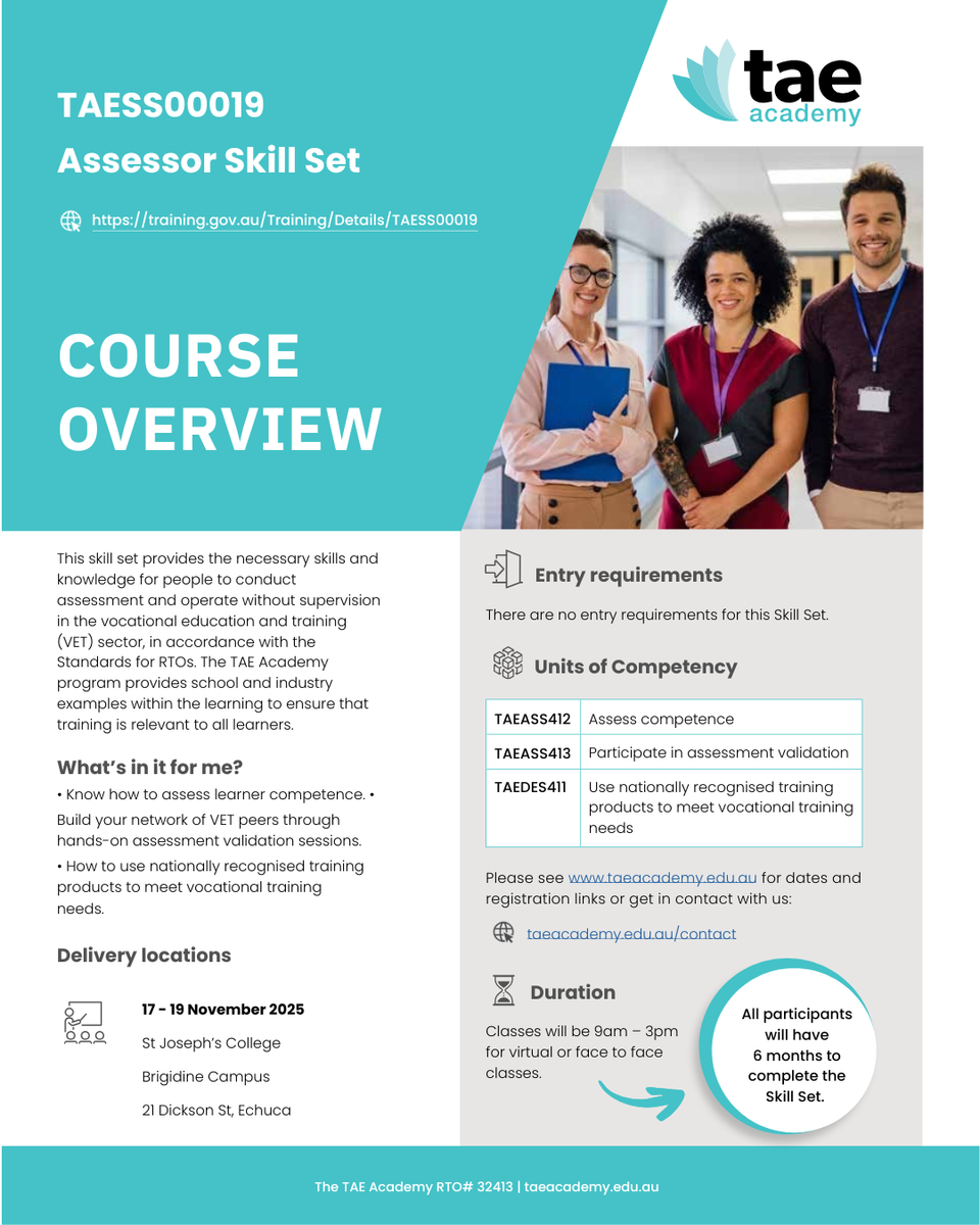 St Joseph’s College Echuca is hosting Face-to-Face training for TAESS00019 – Assessor Skill Set (Registered Teachers) onsite from November 17–19.