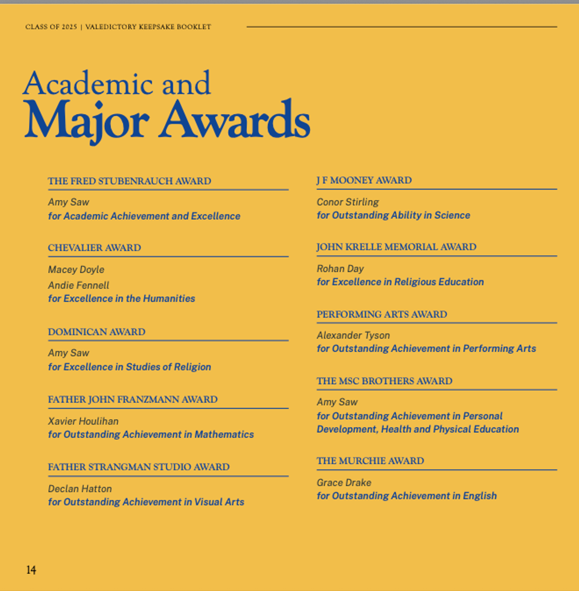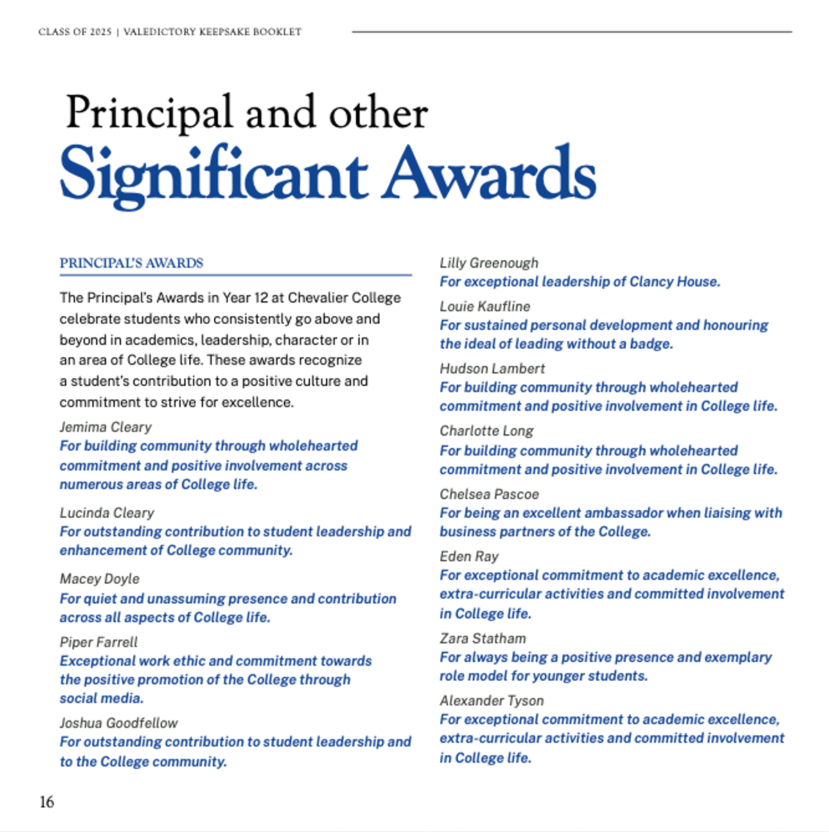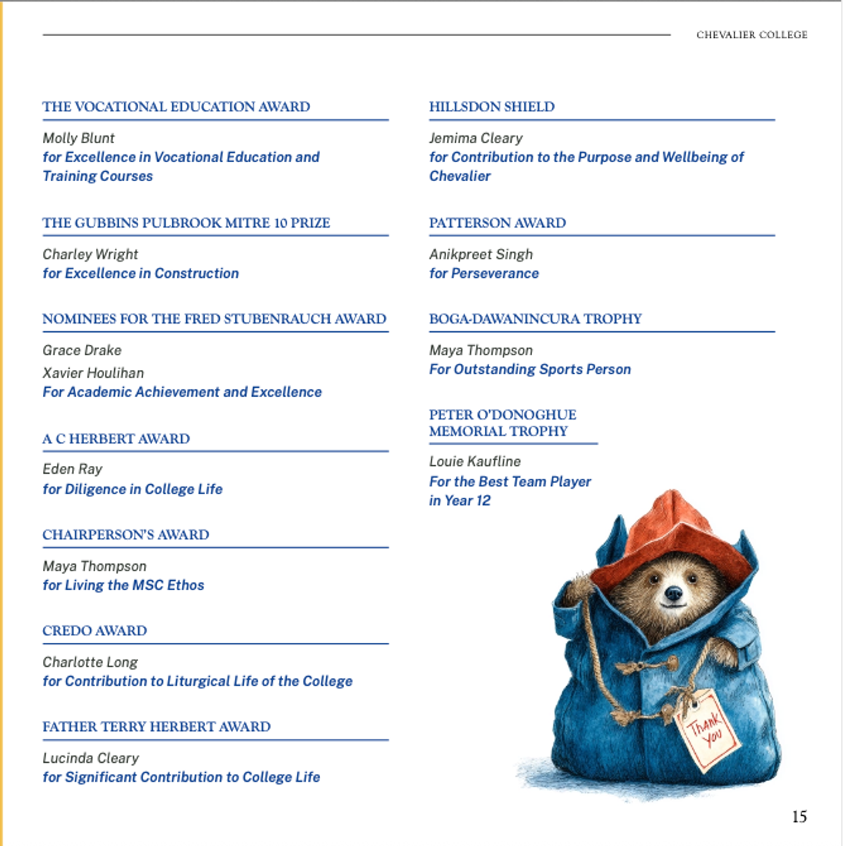 The full list of awards is below, an excerpt from the 2025 'Paddington' themed Valedictory book, a special keepsake for our Year 12 students.