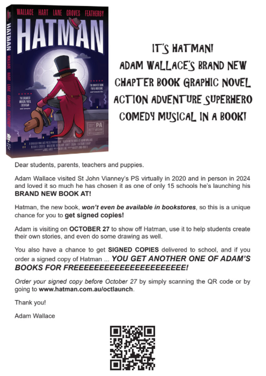 We are thrilled to announce that New York Times best-selling author, Adam Wallace, will be visiting our school on Monday the 27th of October to launch his brand new book - Hatman!!!