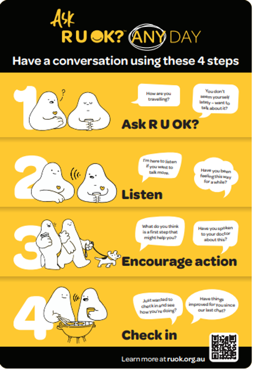 By starting a conversation and commenting on the changes you’ve noticed, you could help that family member, friend or workmate open up. If they say they are not OK, you can follow the conversation steps to show them they’re supported and help them find strategies to better manage the load. If they are OK, that person will know you’re someone who cares enough to ask.