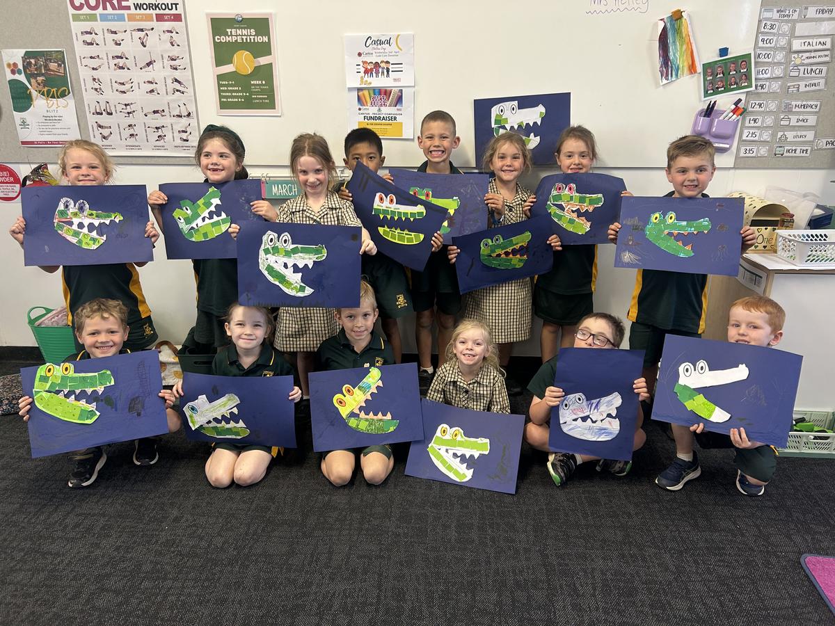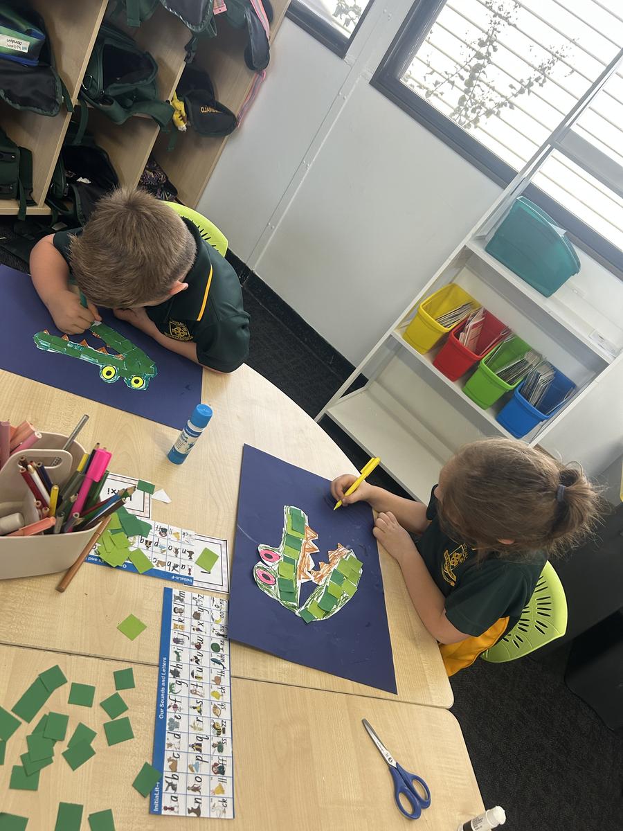 As part of our InitiaLit Storybook lessons, we have been exploring the beautiful picture book The River by Sally Morgan. To bring the story to life, we created paper mosaic crocodiles, carefully piecing together different green-coloured squares to form our artworks. This activity helped develop our fine motor skills while deepening our connection to the themes of the book.
