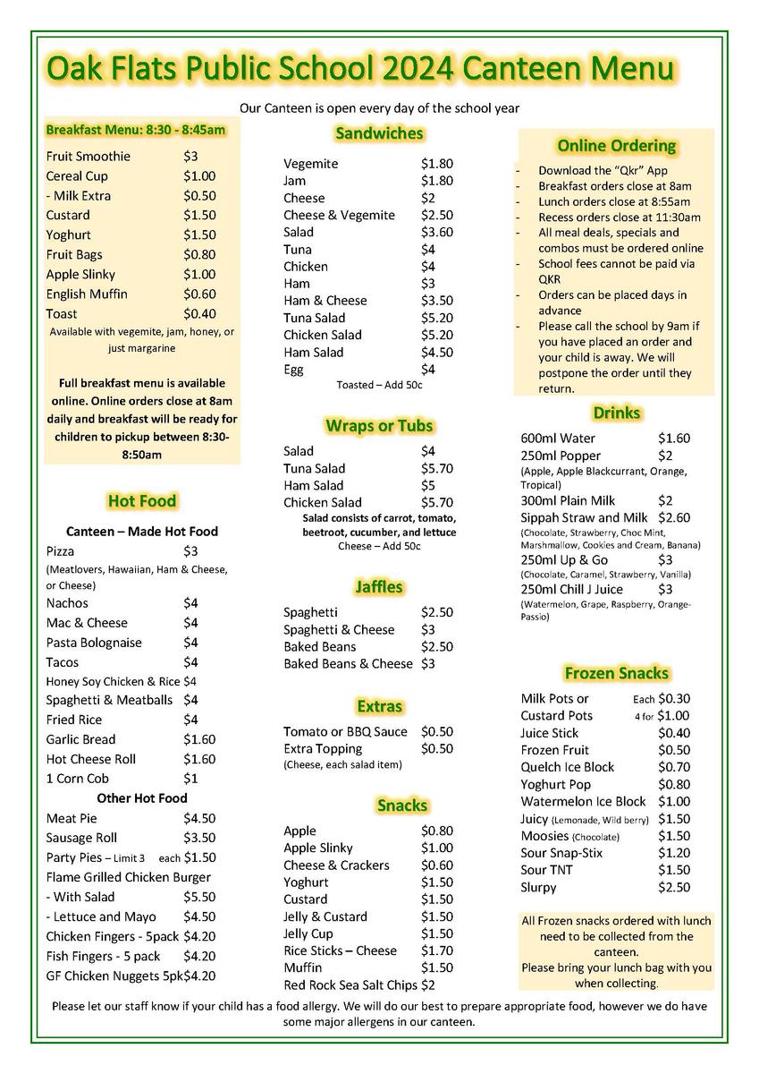 Due to the ongoing increase in costs of ingredients and stock, the canteen will be implementing a small price increase on some menu items. The P&C have previously been absorbing these costs, and we assure you we have tried to keep new prices as affordable as possible. We thank you for your support. Price increase will be effective as of Term 2.