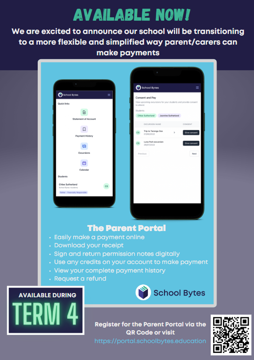 If you haven’t already, parents are encouraged to download the School Bytes Parent Portal App. This app will allow for parents and carers to easily make payments, download receipts and conveniently complete digital permission notes. If you need any support, please contact our office so they can assist.
