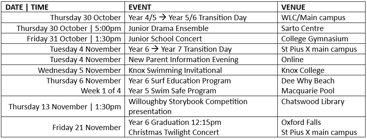 We’re excited to highlight everything St Pius X Junior School has to offer during our New Parent Information Night on Tuesday 4 November. The event will begin at 6:00 pm and will be held online. I’m reaching out to see if there’s a courageous Year 5 parent who might be willing to share their experiences as a new family at St Pius X. It would be fantastic for our new parents to hear from someone who has experienced it all! If you’re interested, please let me know by emailing Mrs Hawthorne:
