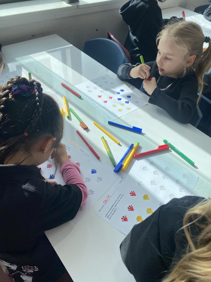 Students in Grades 1 and 2 have continued to develop their physical description skills by combining adjectives like grande (big) and pequeño (small) with numbers up to 10. One of their favourite warm-ups has been jumping while counting in Spanish — a fun way to stay active and warm during these cold mornings! Through games such as memory cards and “gratitude races”, they have practised linking colours and numbers in meaningful ways. They’ve also reinforced basic greetings and classroom routines in Spanish through songs and playful learning.