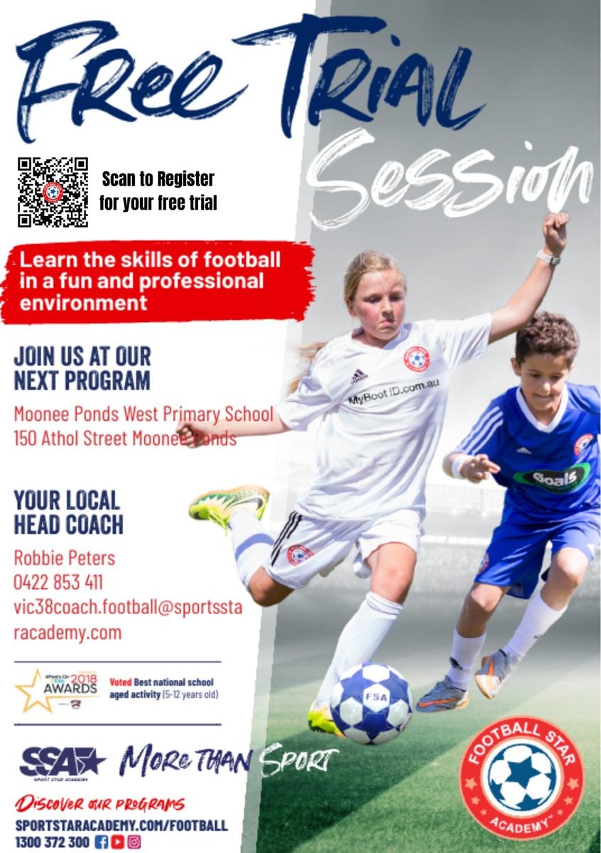 Give your child the chance to experience the thrill of football with a FREE 1 week trial at Football Star Academy! Our programs are designed to build confidence, skills, and teamwork in a fun, inclusive and professionally run environment. Whether your child is new to football or already loves the game, this is a great opportunity to try something exciting, make new friends and stay active. open to boys and girls aged 5-15. Book you free trial today.