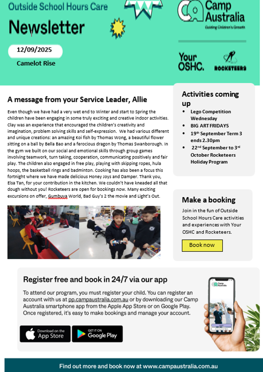 By staying connected online, you’ll receive regular updates about school news, upcoming events, and community activities. It’s a great way to stay informed and engaged with everything happening at Camelot Rise.
