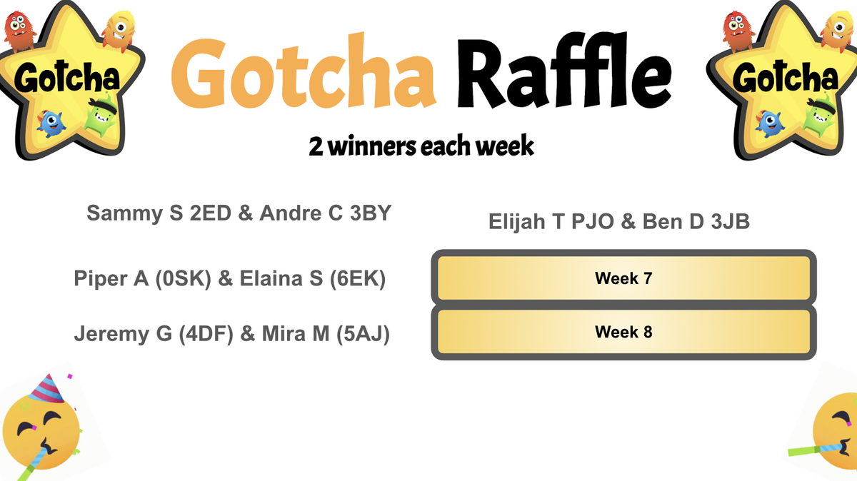 Our Term 2 Gotcha winners are yet to recieve their prizes, this will be done at then end of Term 3 to join in with the Term 3 winners. A big congratulations to our Term 3 Gotcha winners so far, keep up the positive behaviour!