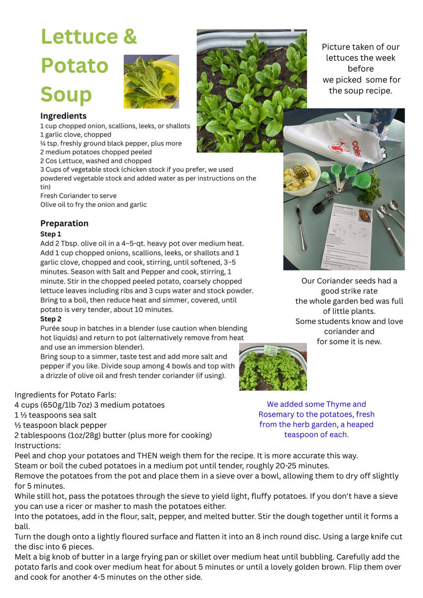 We made Lettuce & Potato Soup with Potato Farls. We picked leeks, lettuce and coriander. The lettuce had self-sown and we had received lots of potatoes from the food bank. We challenged ourselves to find a different way to use lettuce. It’s important to not waste excess vegetables. Coriander and leeks were growing well. We researched if lettuce could be used in soup and discovered any leafy green can be added to enrich soup. We found a recipe and adjusted it by using vegetable stock keeping it vegetarian and halal. We doubled the recipe as we had plenty of vege. Before we cook we explore the herb garden to see what we can pick. The students bring in the herbs, wash them and take them to the table. The younger students use scissors, while older students, with knife training, use the knives and chopping boards. Students are learning to identify herbs and recognise their flavours. To add to the lunch we decided to find another way to use up the potatoes and found a recipe for Potato Farls. Students enjoy experimenting with flavours so we added Rosemary and thyme to the Potato Farls recipe. Students came back for seconds!