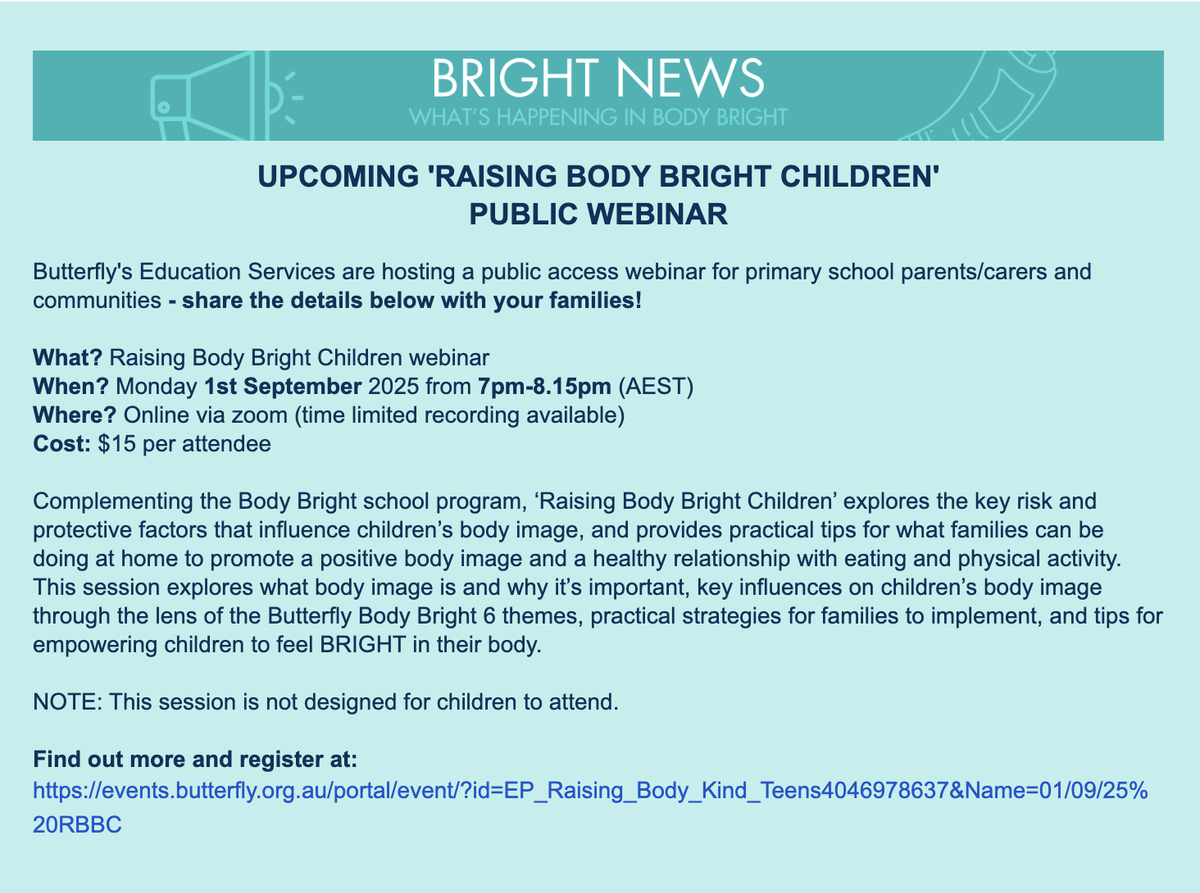 - A webinar run by The Butterfly foundation on raising Body Bright Children. Details are below.